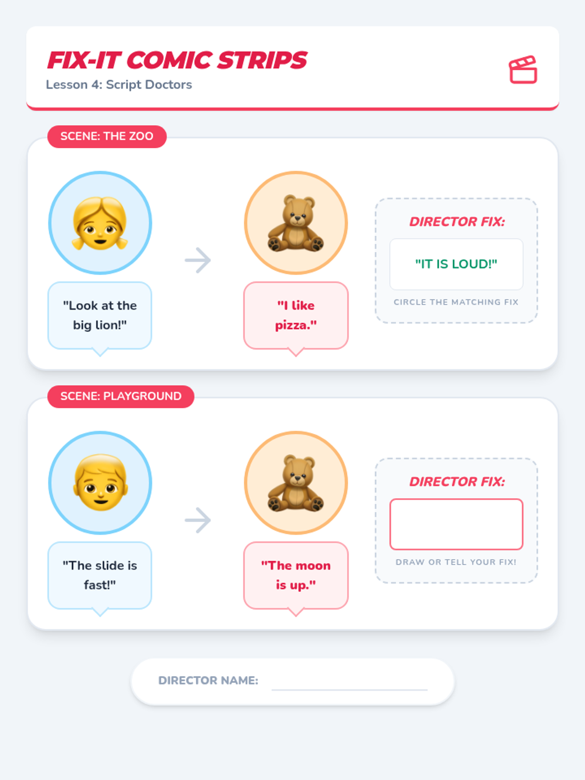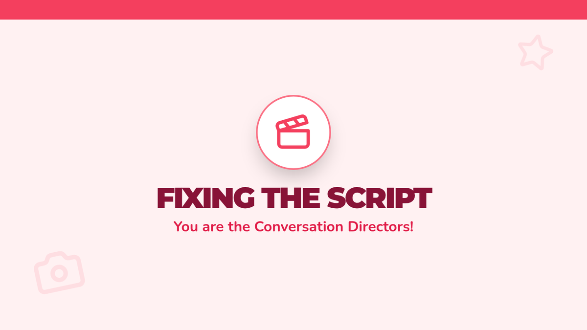 Students act as 'directors' to fix broken conversation scripts, suggesting relevant alternatives for the puppet's off-topic mistakes.
