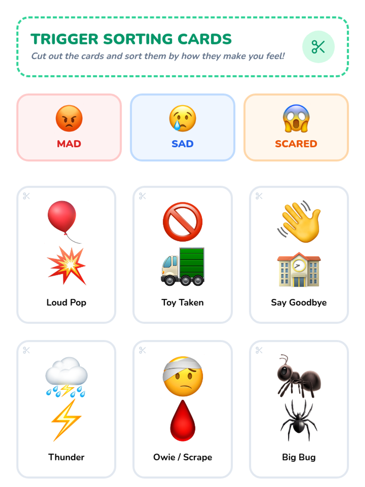 Students classify common classroom scenarios as triggers for different emotions, building a vocabulary for cause-and-effect.