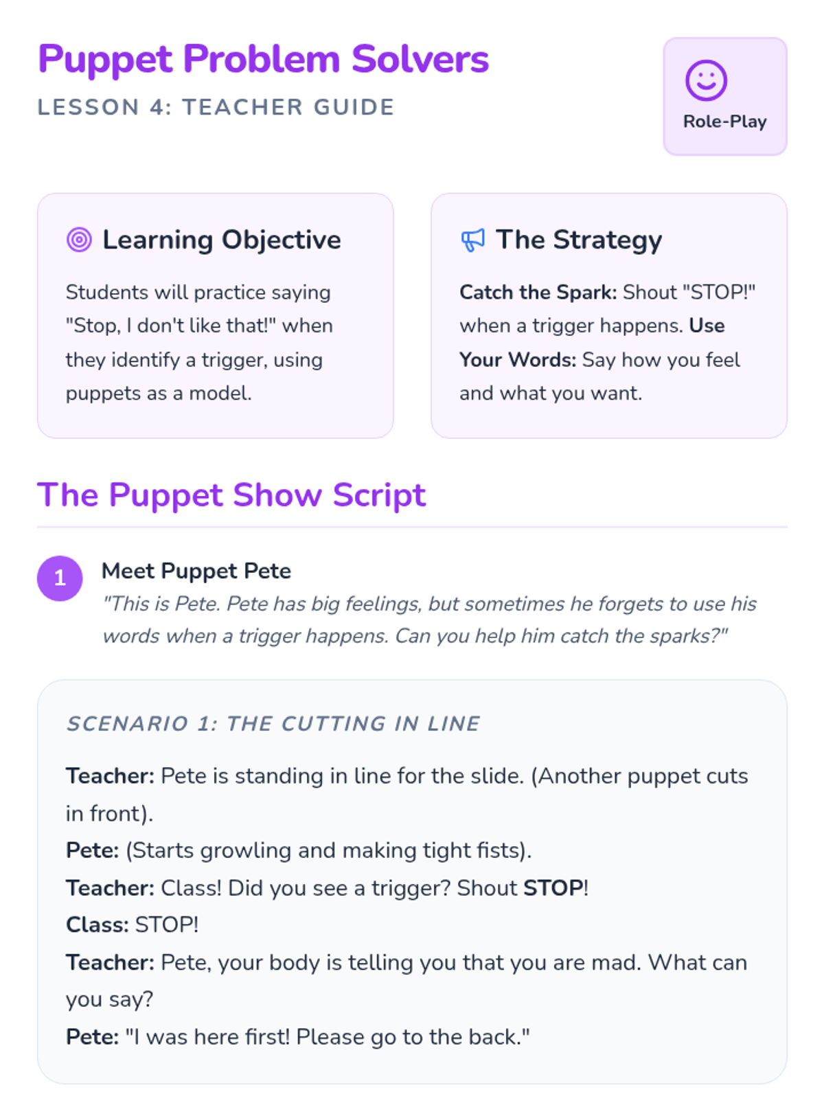 Using puppets, students practice identifying triggers and using verbal strategies to respond appropriately to social antecedents.