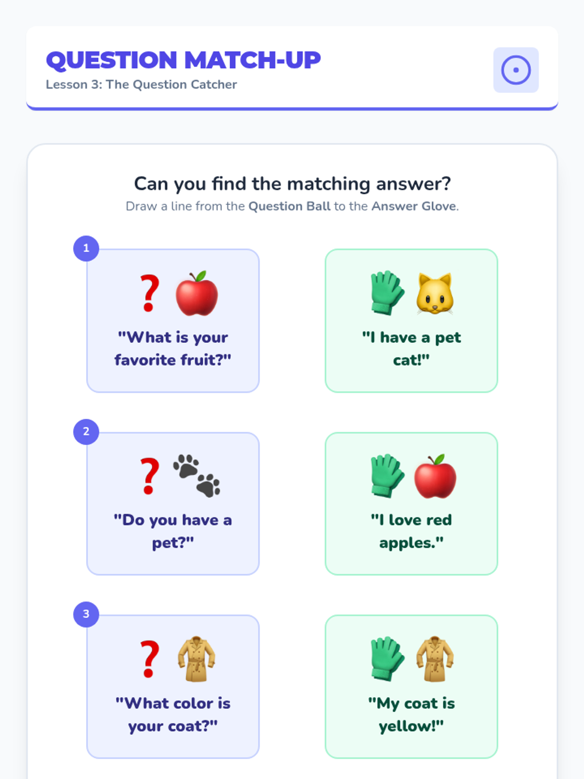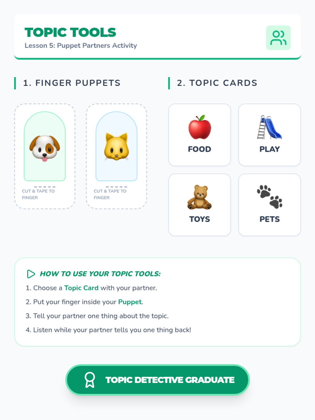 Students apply their skills in short peer-to-peer interactions using finger puppets and designated topic cards for focused practice.