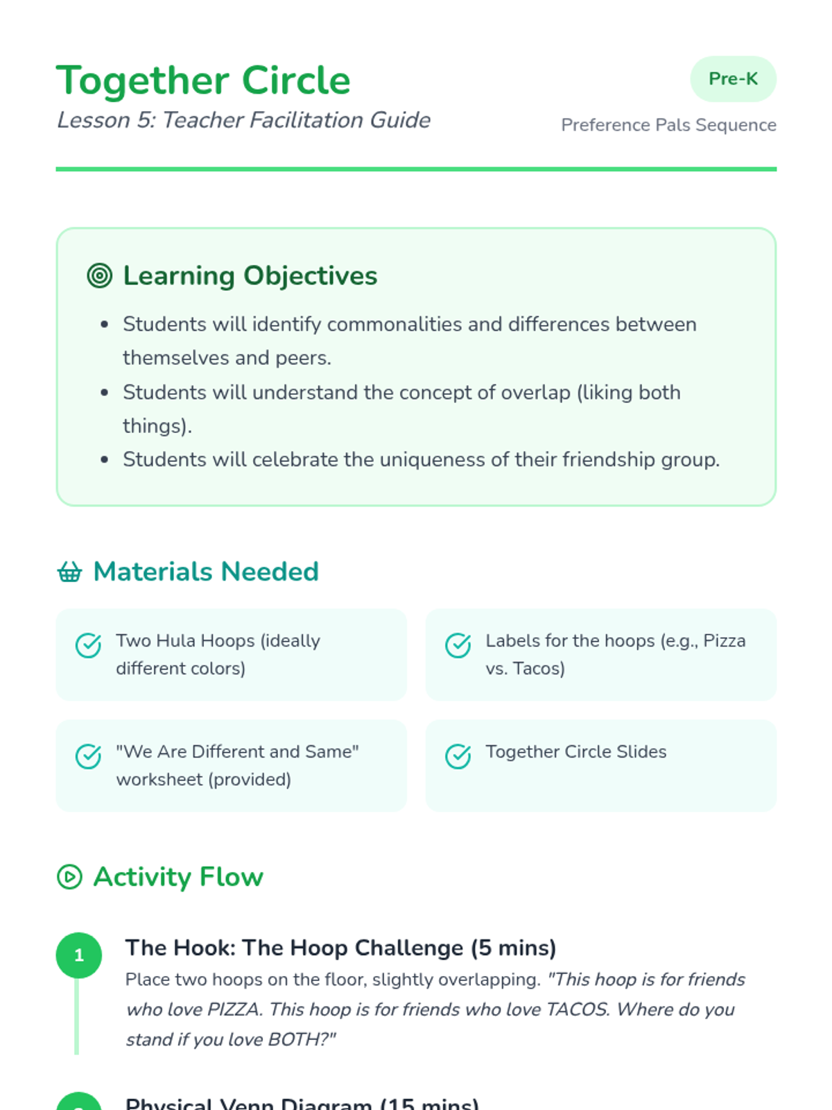 Using a physical Venn diagram activity, students visualize how they can share some interests with friends while keeping their own unique preferences.