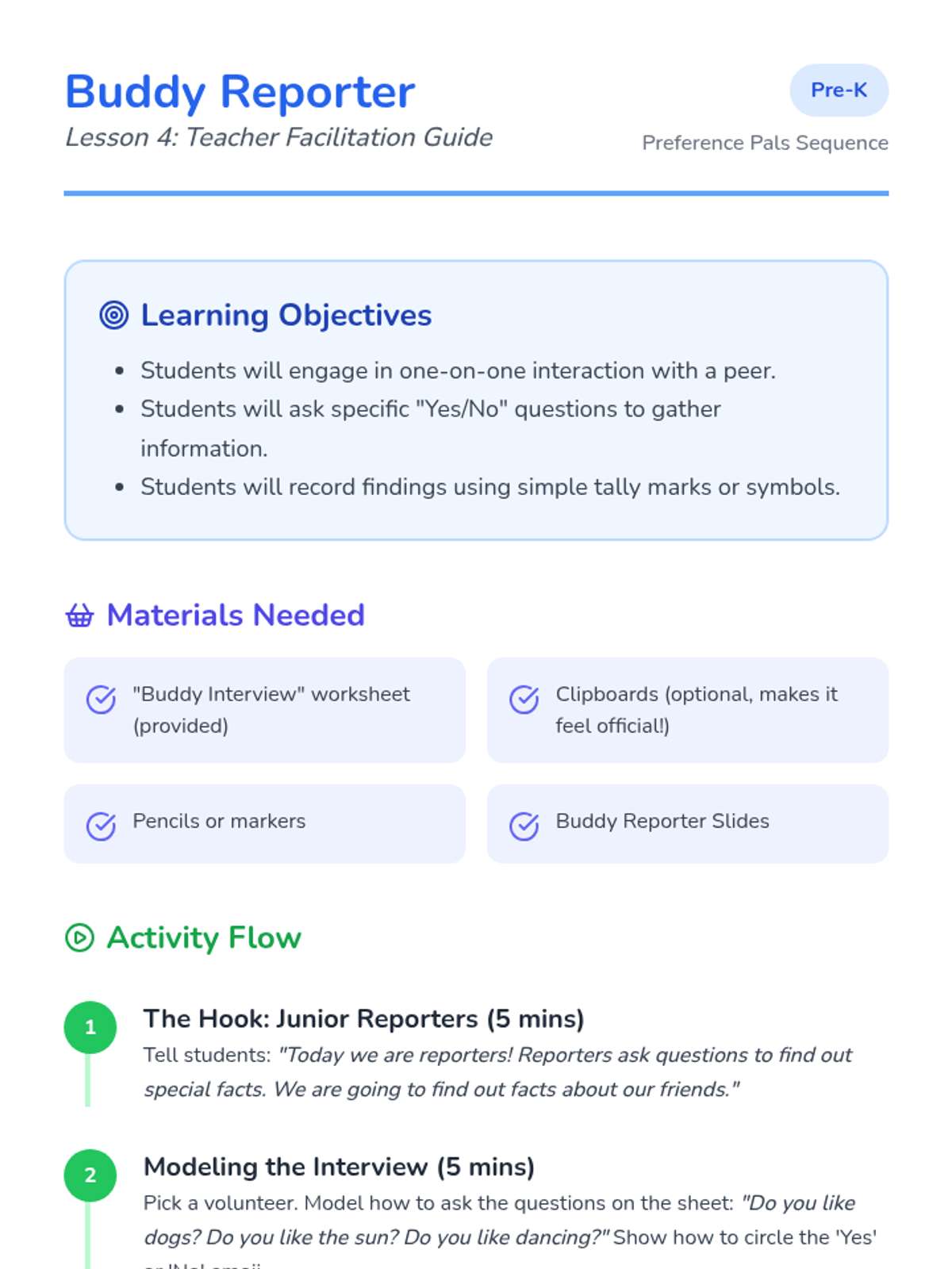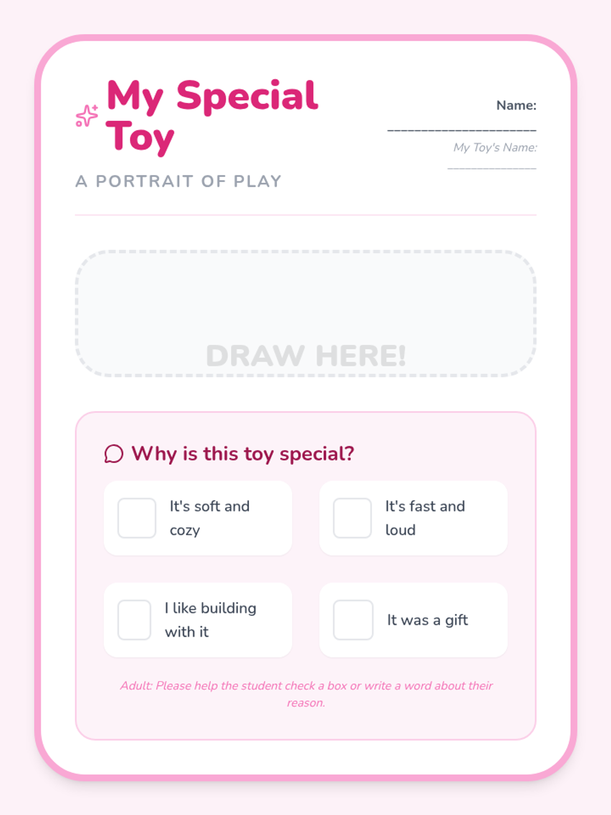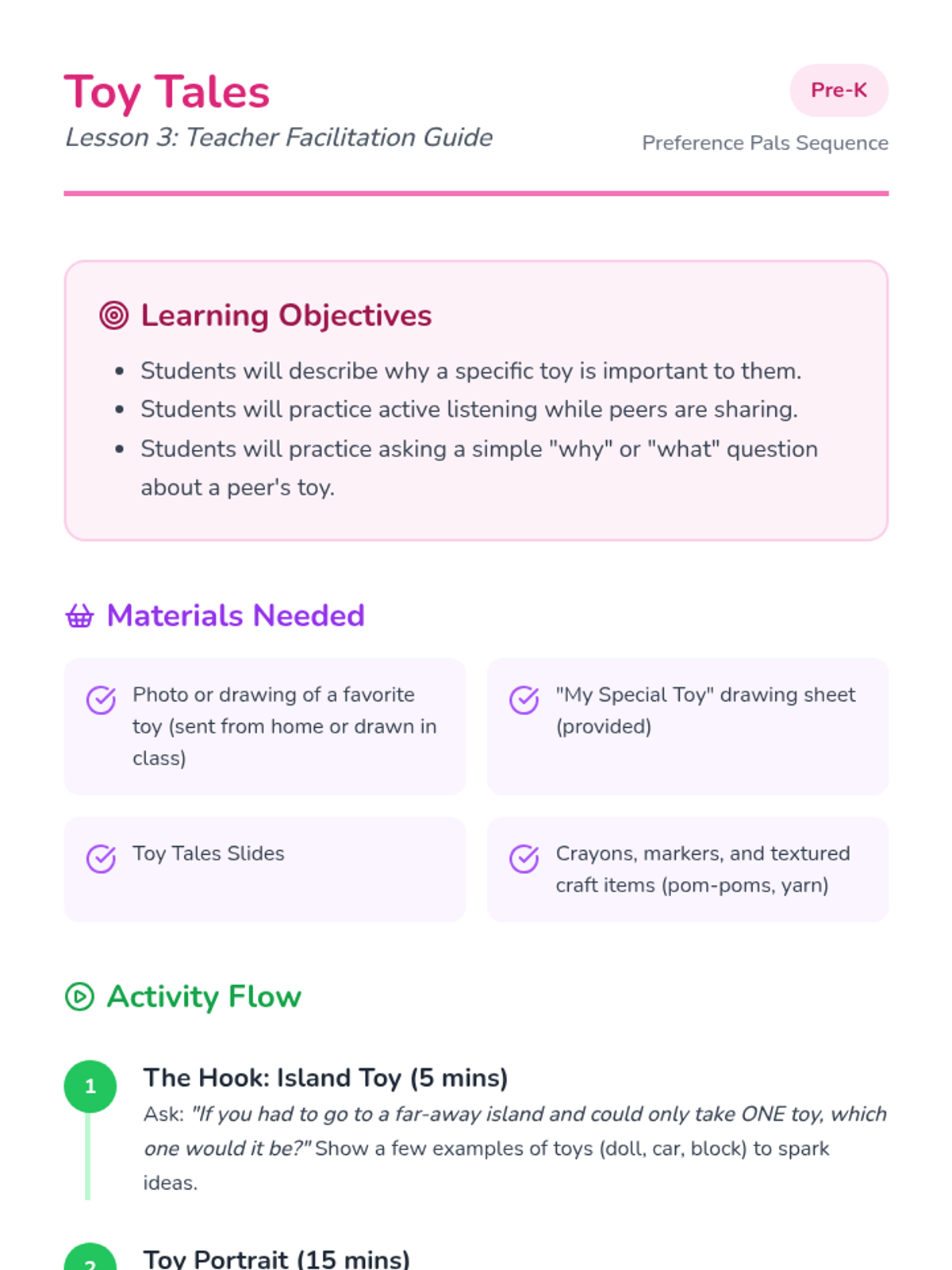 Students share their favorite toys and learn to ask questions about others' interests, fostering respect and oral communication.