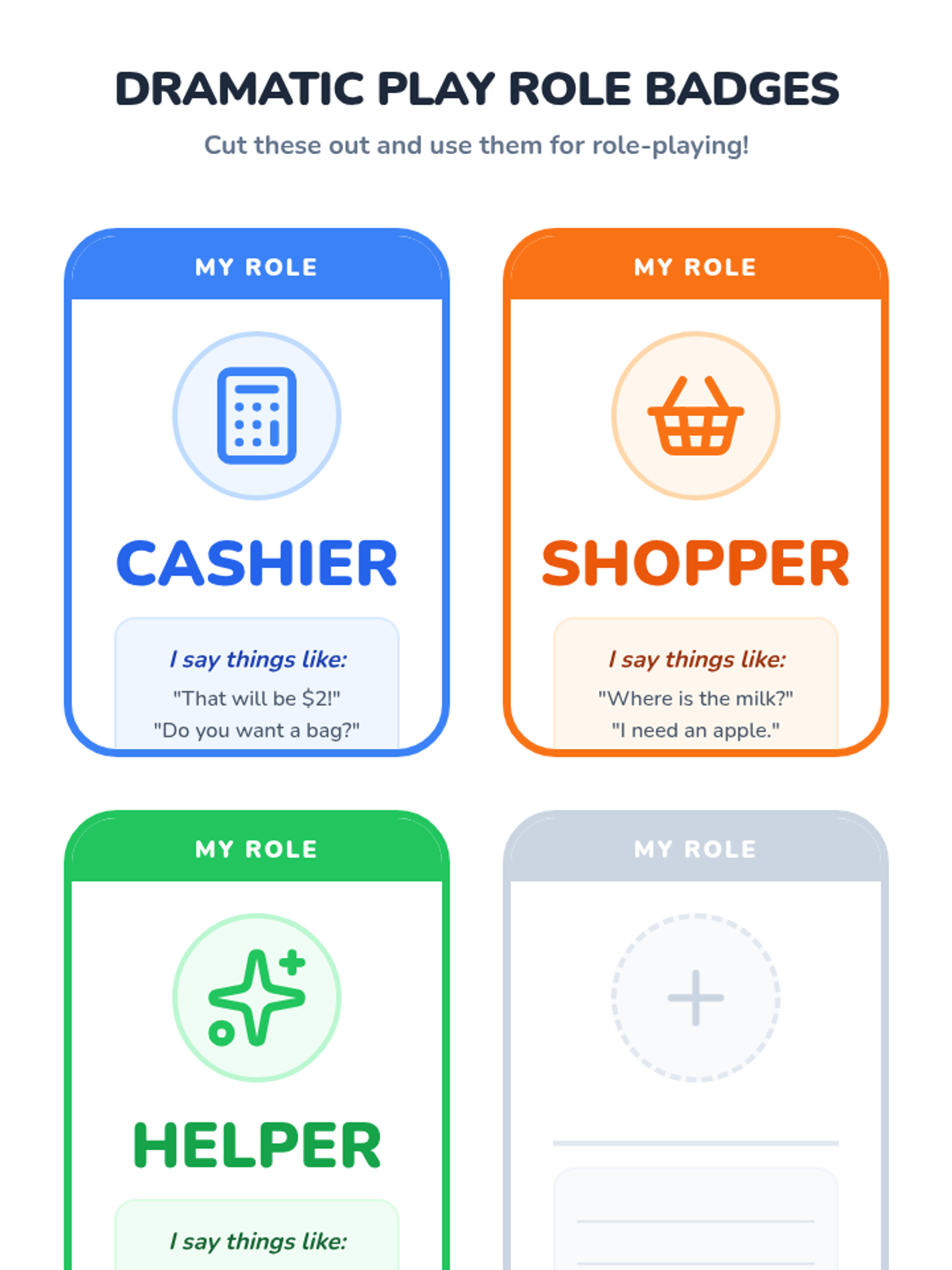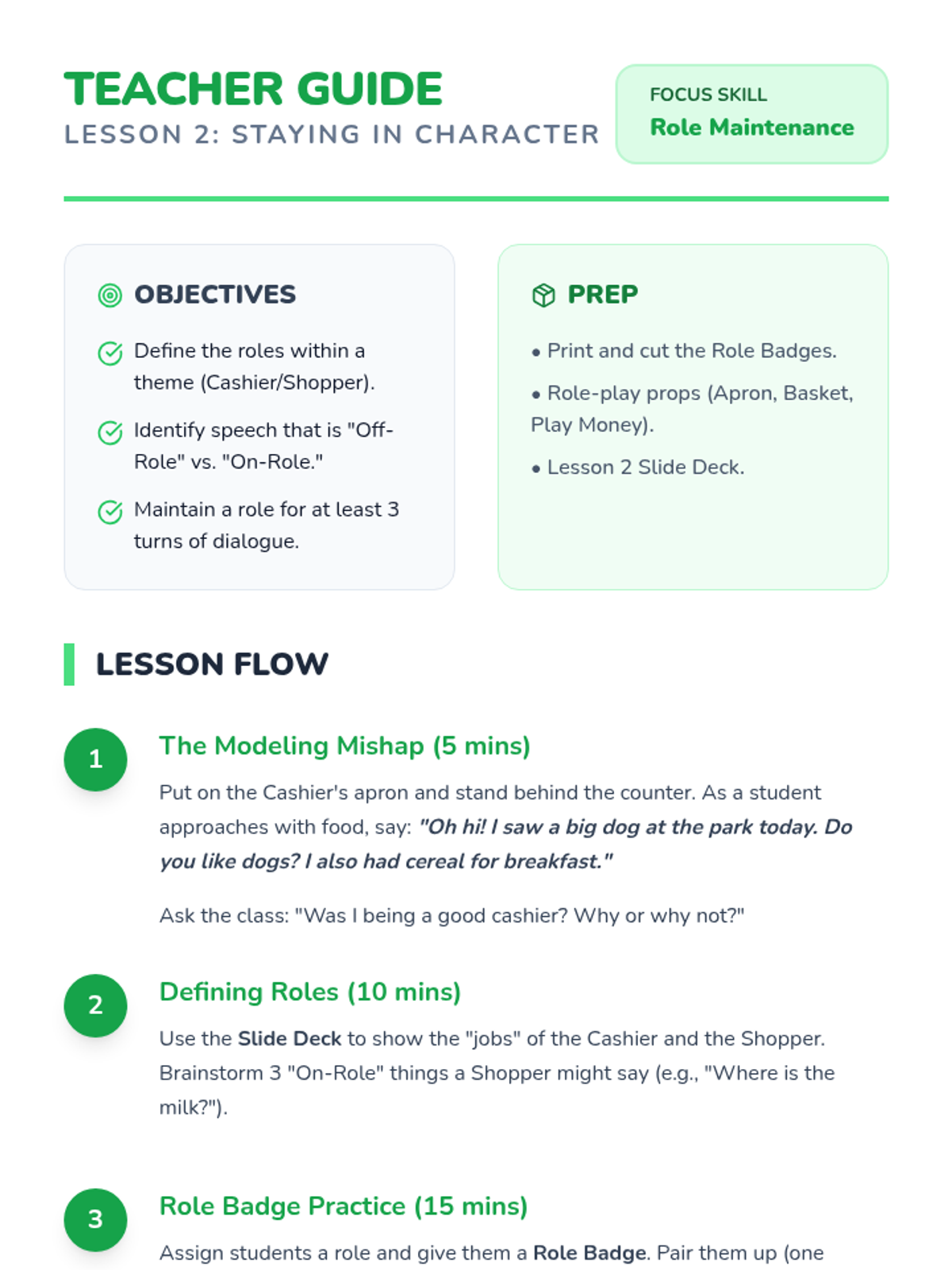 Students practice role-playing specific characters (e.g., Cashier, Shopper). They learn that the Cashier talks about prices and food, not about their new shoes or what they watched on TV, to keep the game fun.
