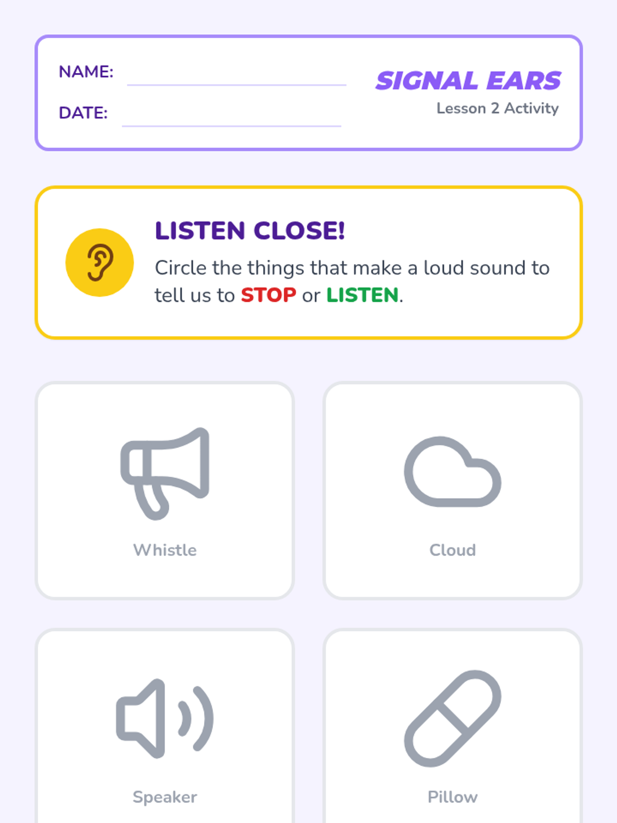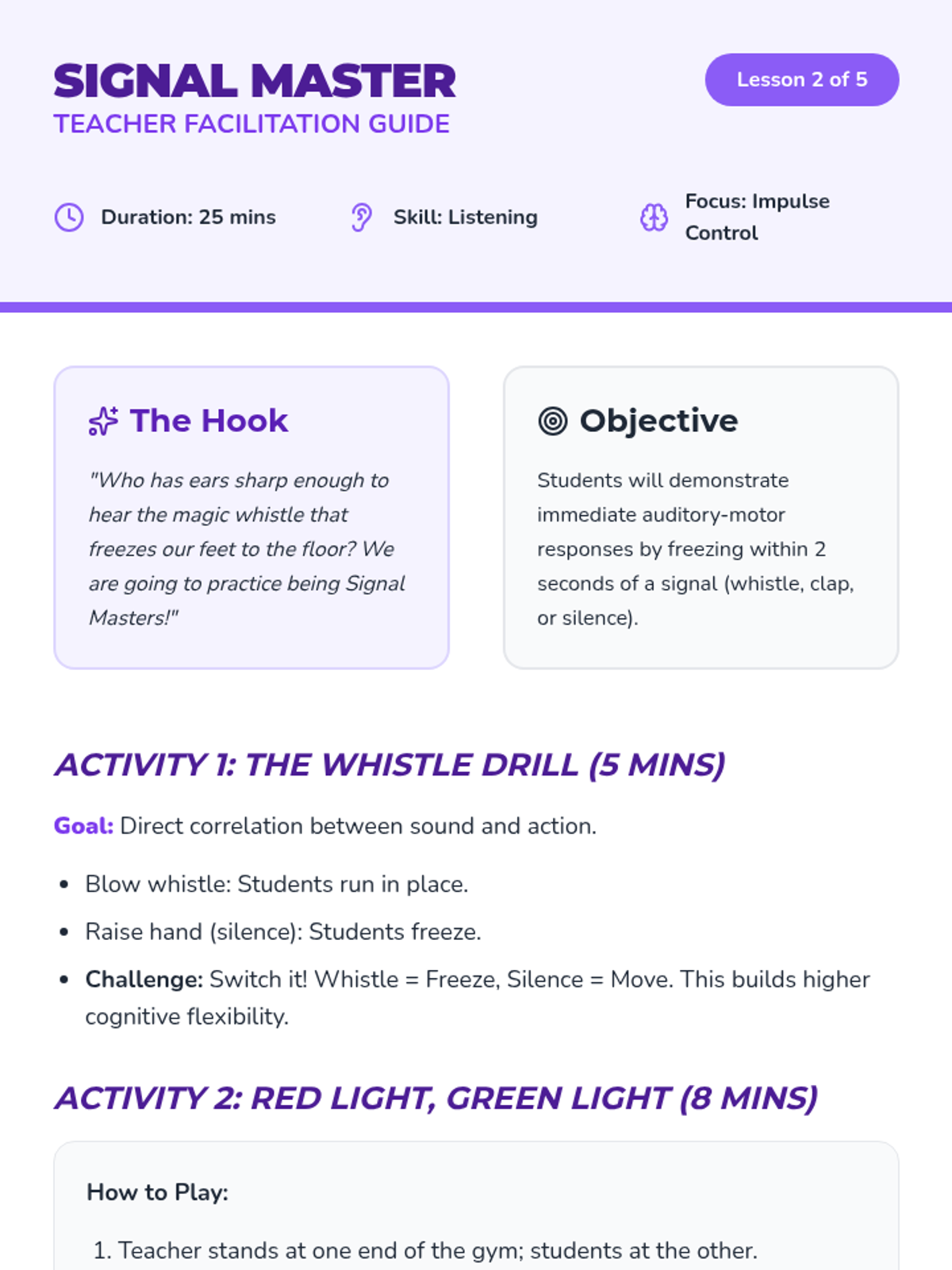 Children practice immediate reactions to auditory signals like whistles and music. This lesson focuses on impulse control and respecting the signal-giver's instructions.