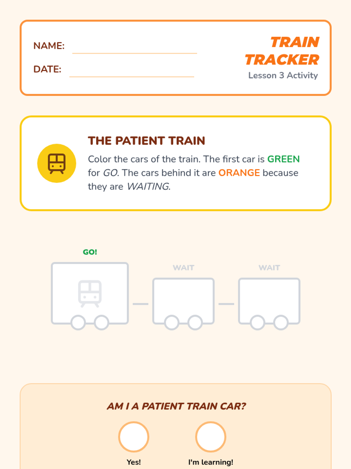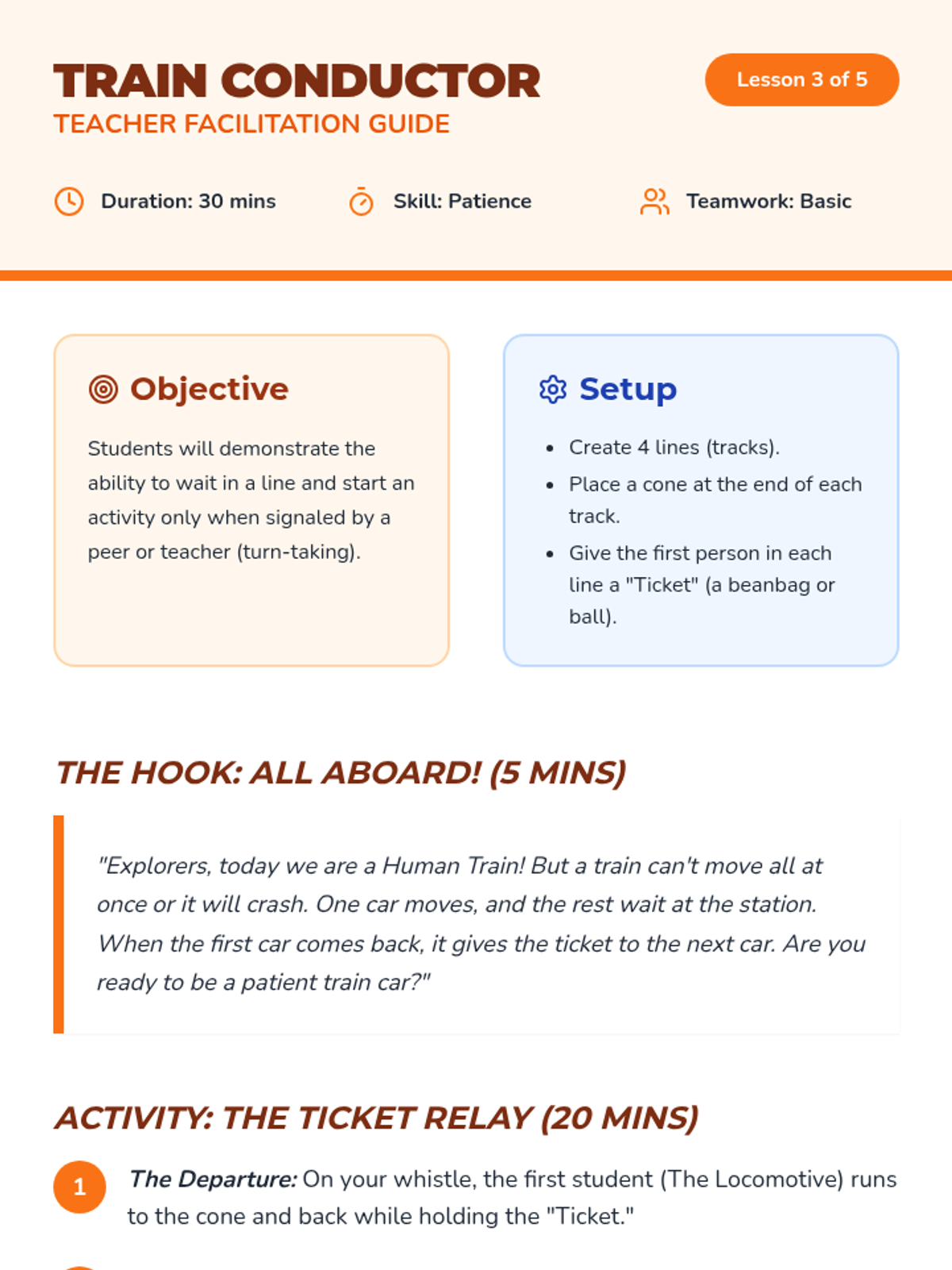 Using a 'human train' metaphor, students learn the importance of waiting their turn and patience in relay-style activities.
