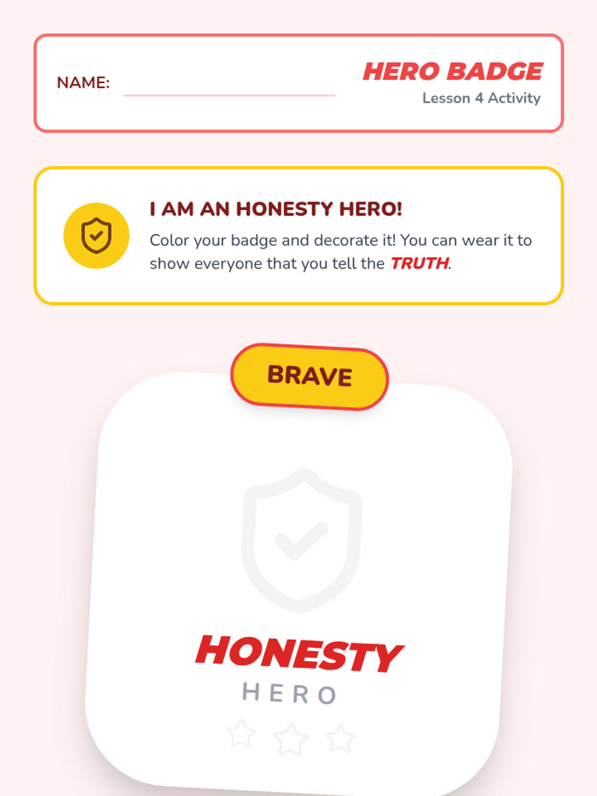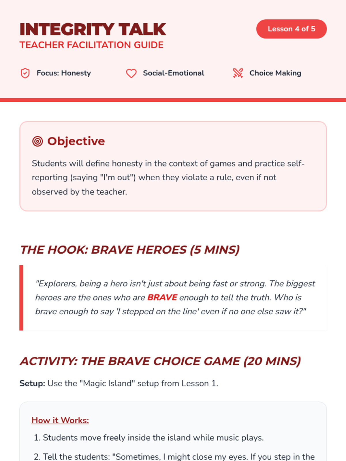Students explore the concept of honesty in games, focusing on self-reporting when out of bounds or tagged. Integrity is framed as a brave and positive choice.
