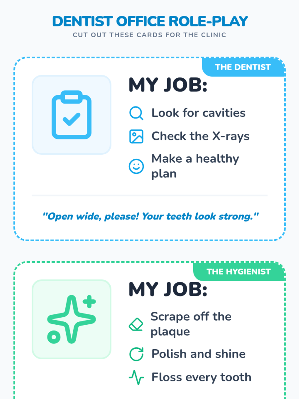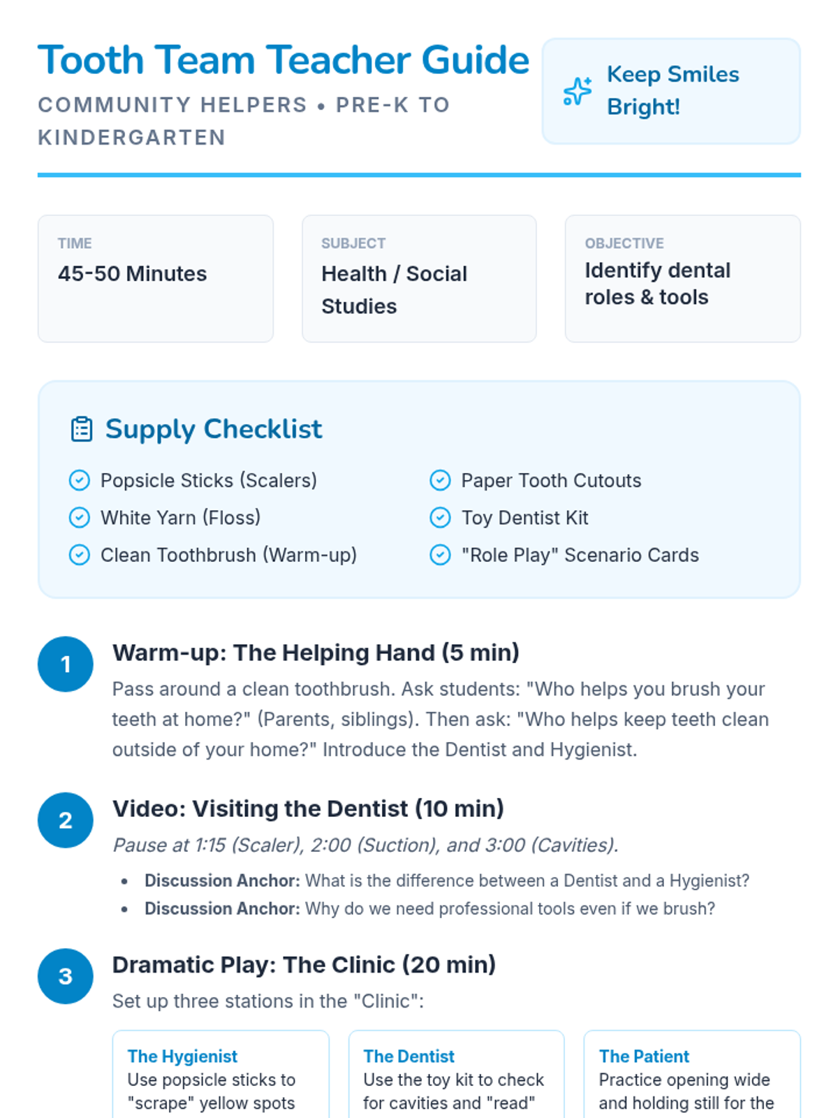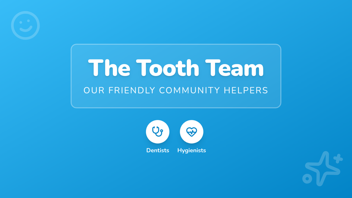 A friendly introduction to dental health for Pre-K and Kindergarten students, focusing on the roles of community helpers in the dentist's office and the tools they use.