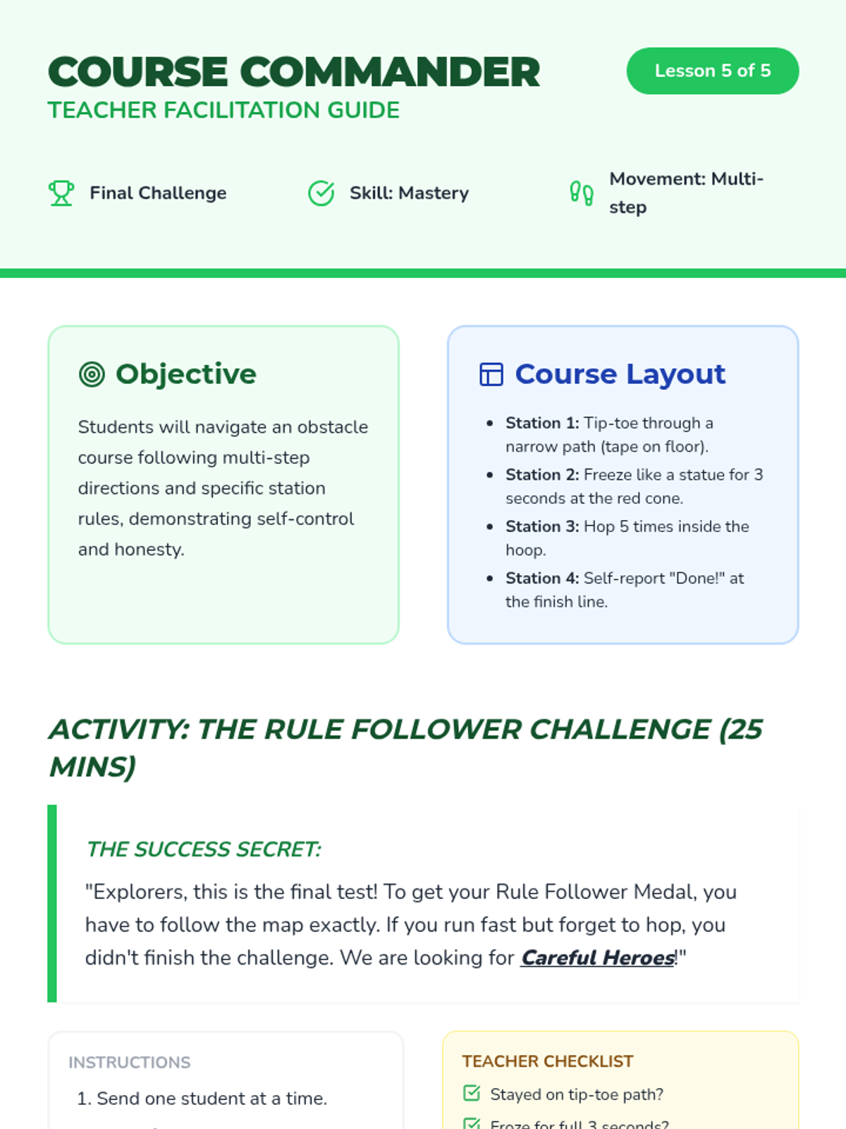 A culminating obstacle course where success is measured by following specific rules rather than speed. Students apply all previously learned skills in a final challenge.
