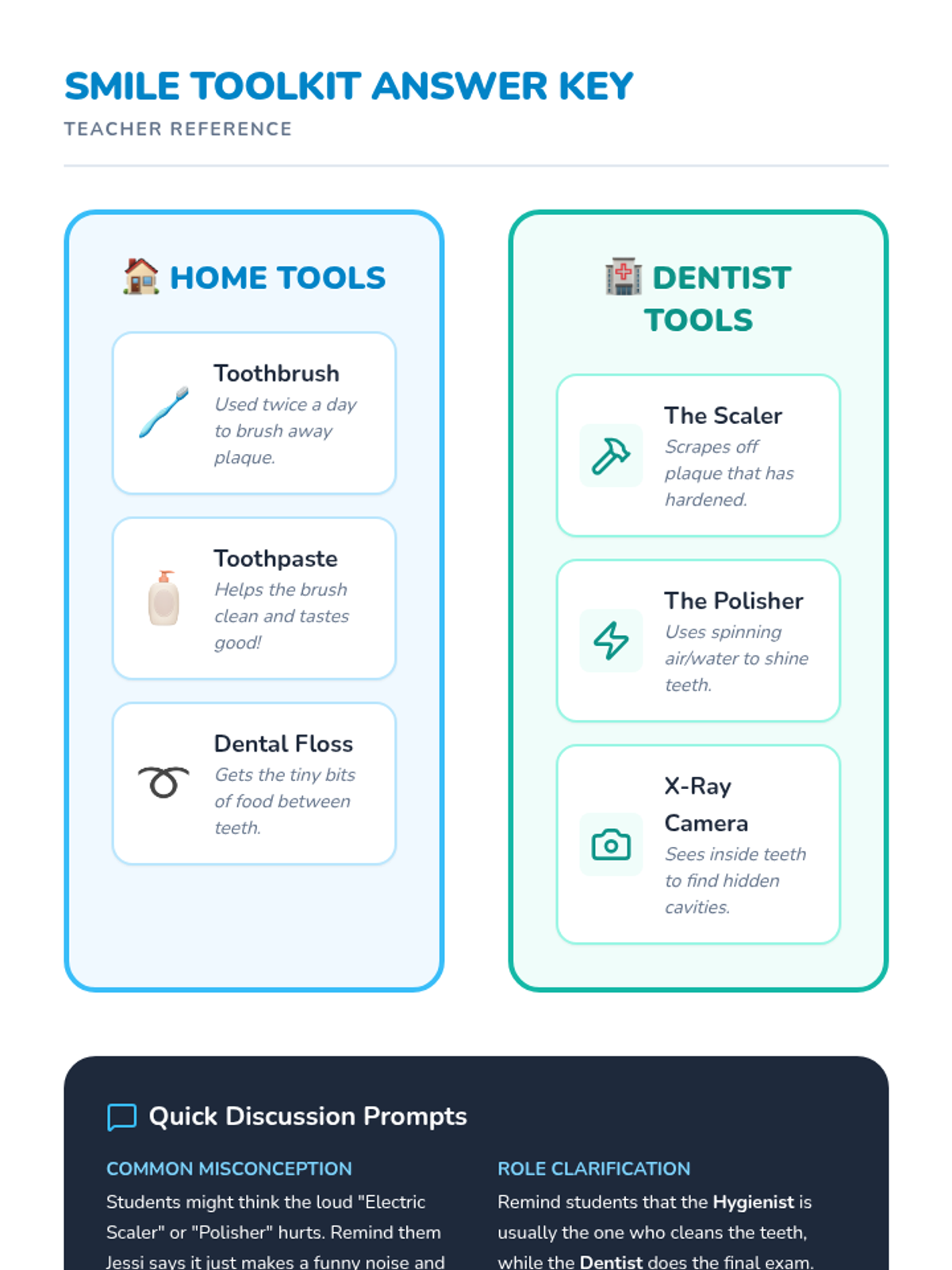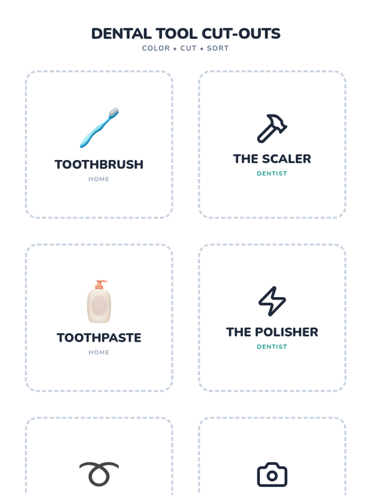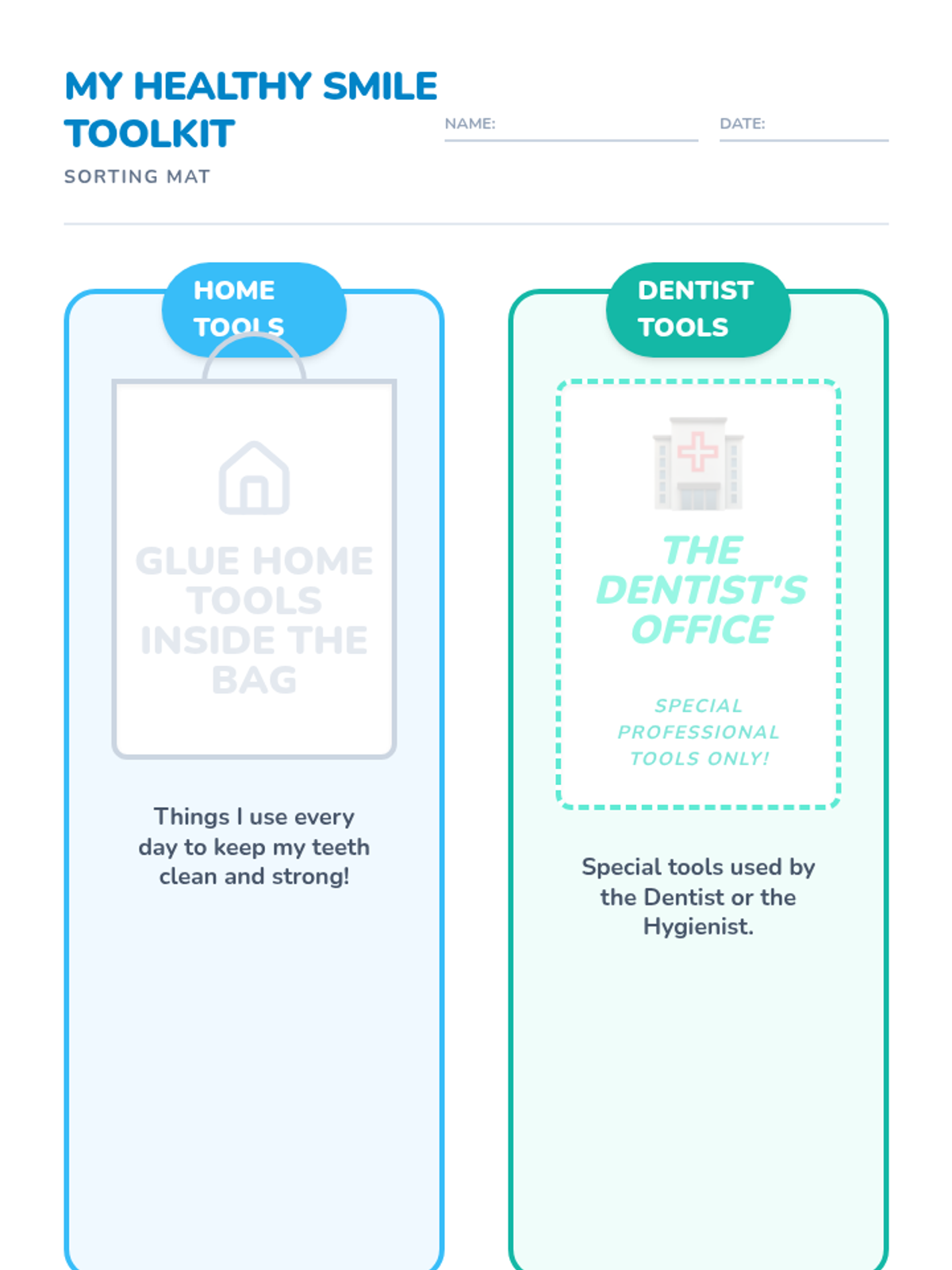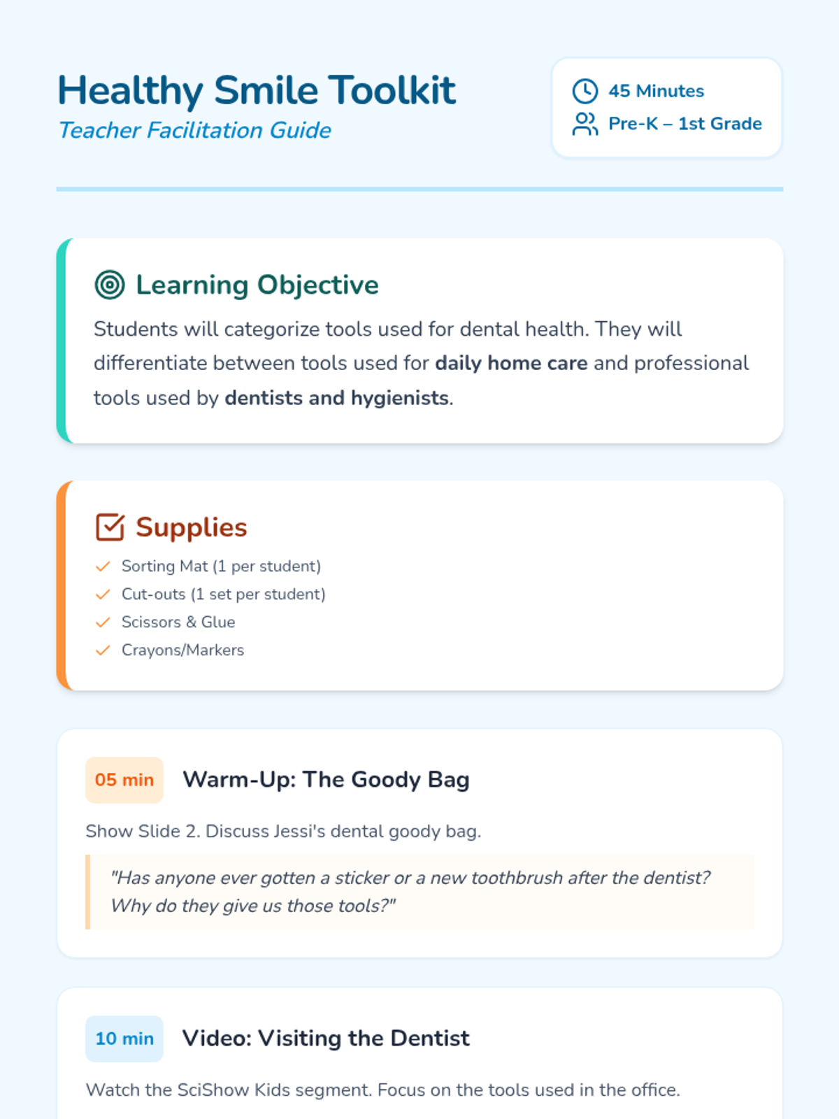 A dental health lesson for Pre-K to 1st grade students to learn about different dental tools. Students categorize home dental care items versus professional tools used by dentists and hygienists.