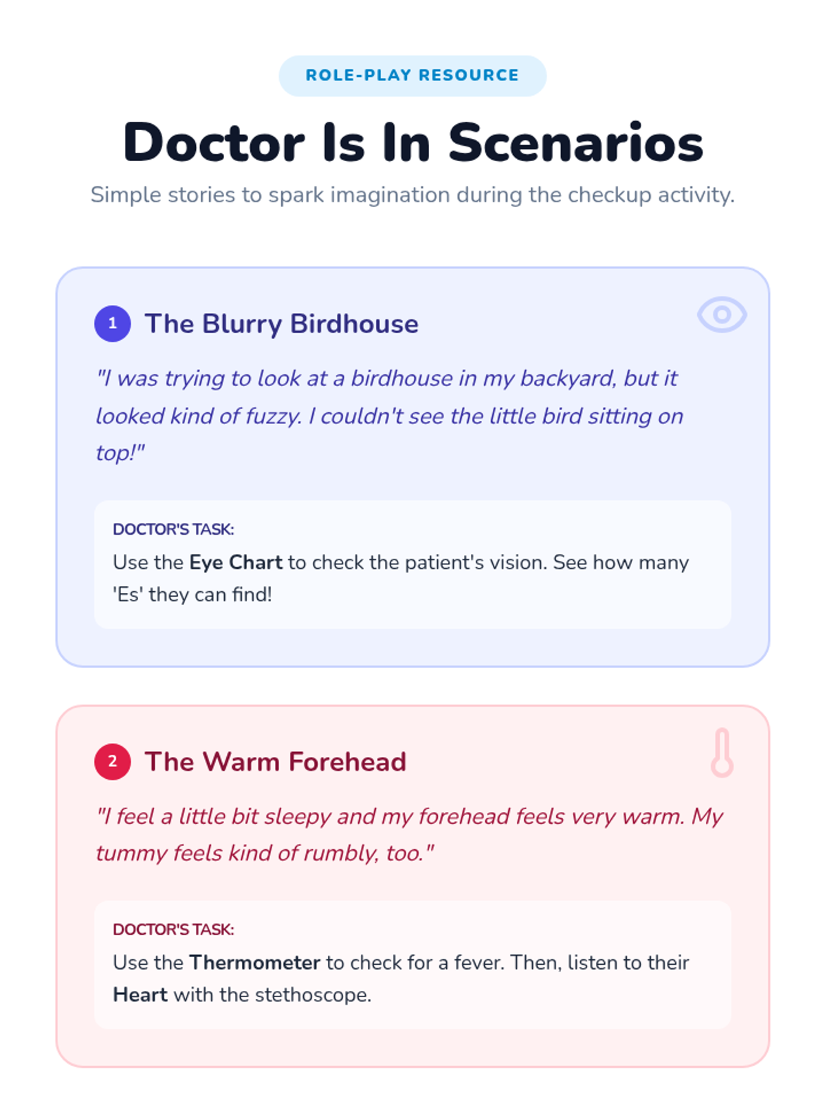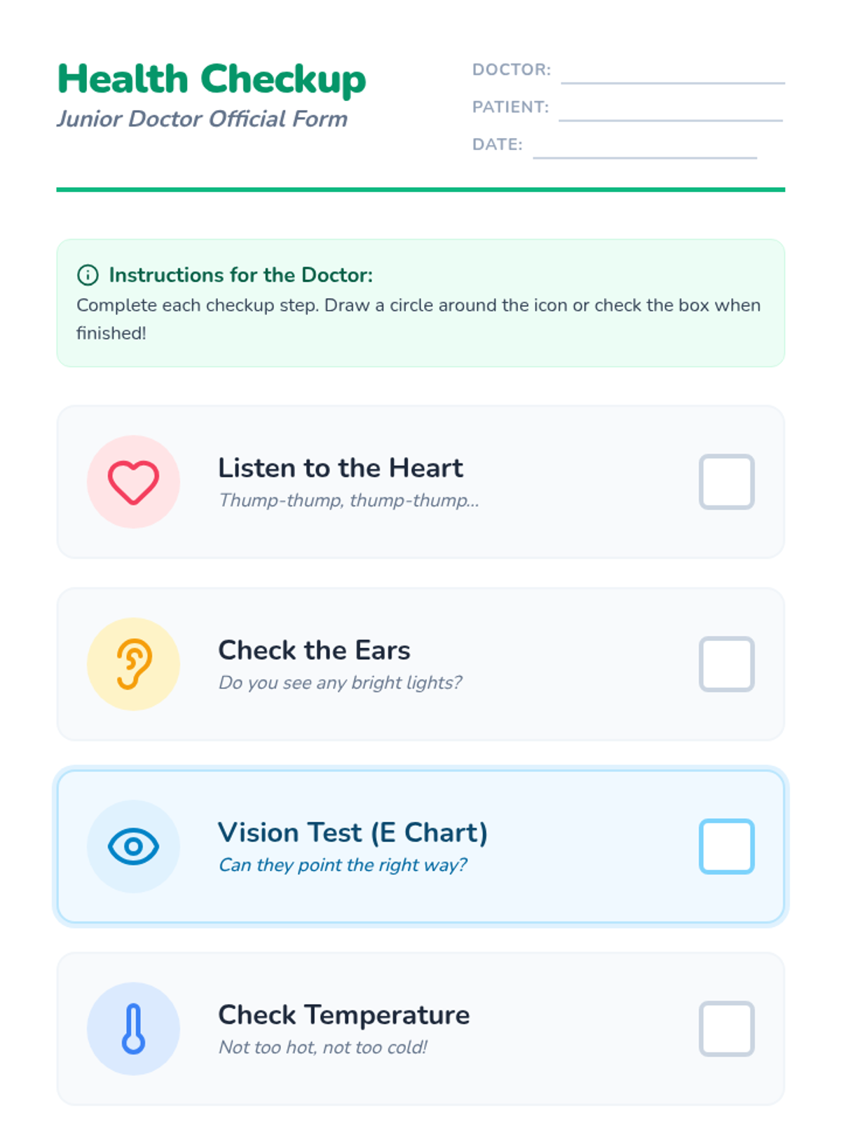 A hands-on introduction to healthcare for Pre-K to 1st Grade, focusing on the roles of doctors, the tools they use for checkups, and a deep dive into eye health through the 'Tumbling E' chart and role-play.