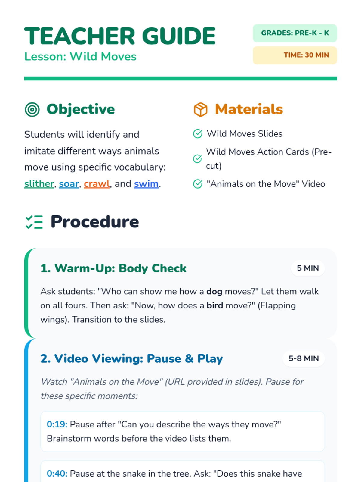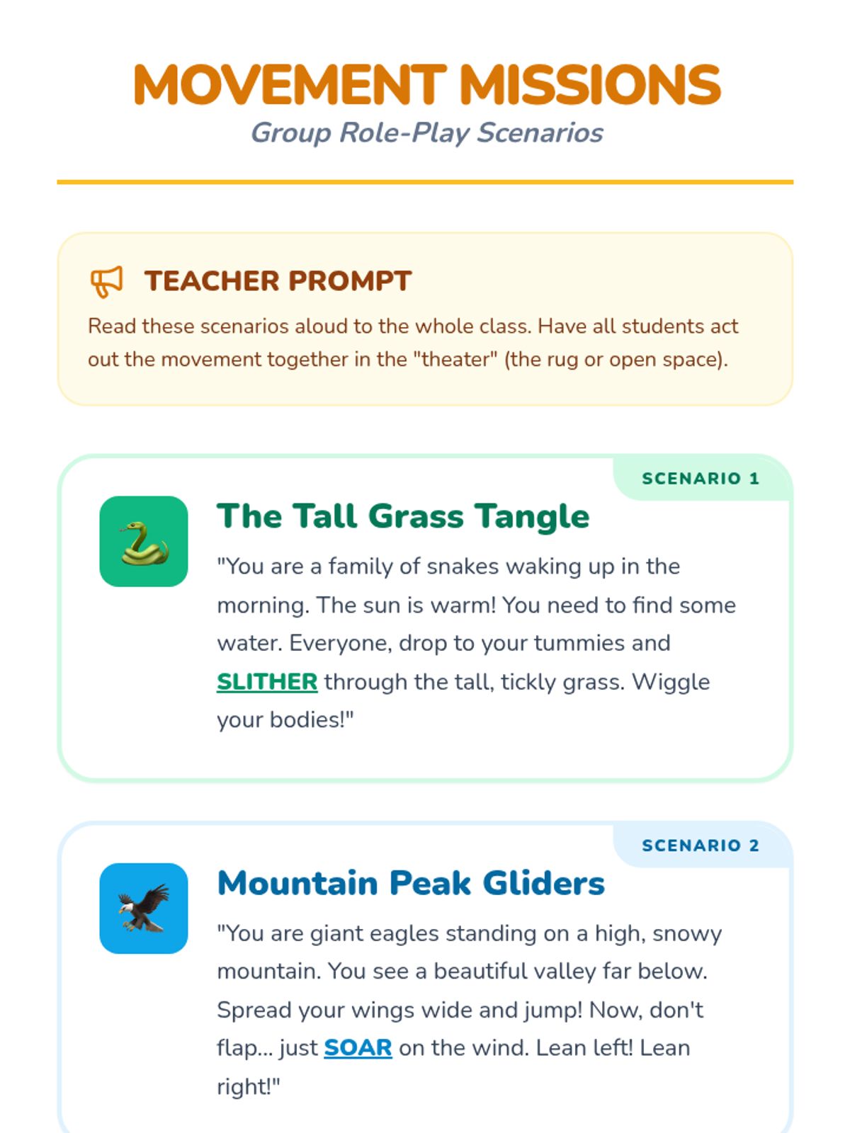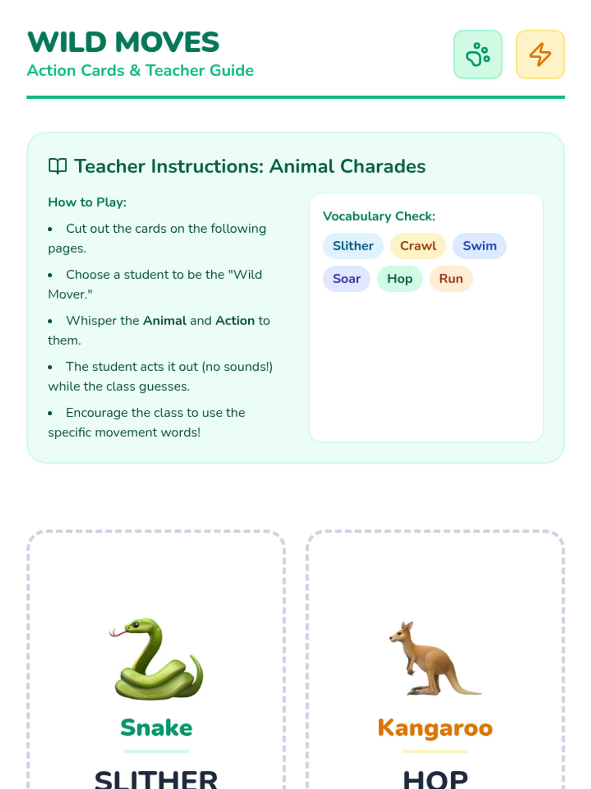 A high-energy, movement-based lesson for Pre-K and Kindergarten students to explore how different animals travel through their environments using specific vocabulary like slither, soar, and crawl.