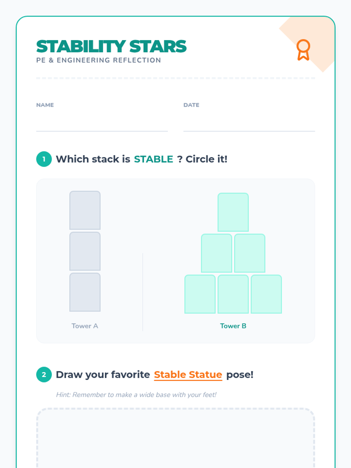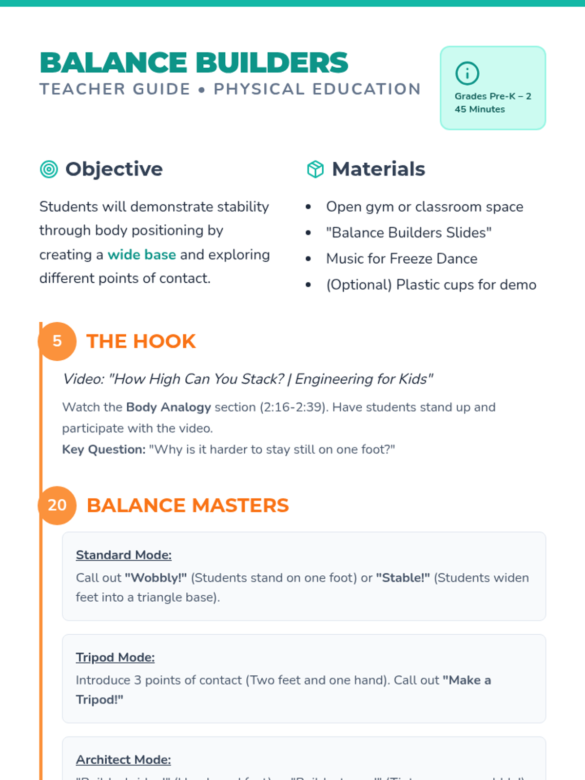 A Physical Education lesson for Pre-K to 2nd grade focusing on the physics of balance and stability. Students explore 'wide bases' through movement games and cup-stacking analogies.