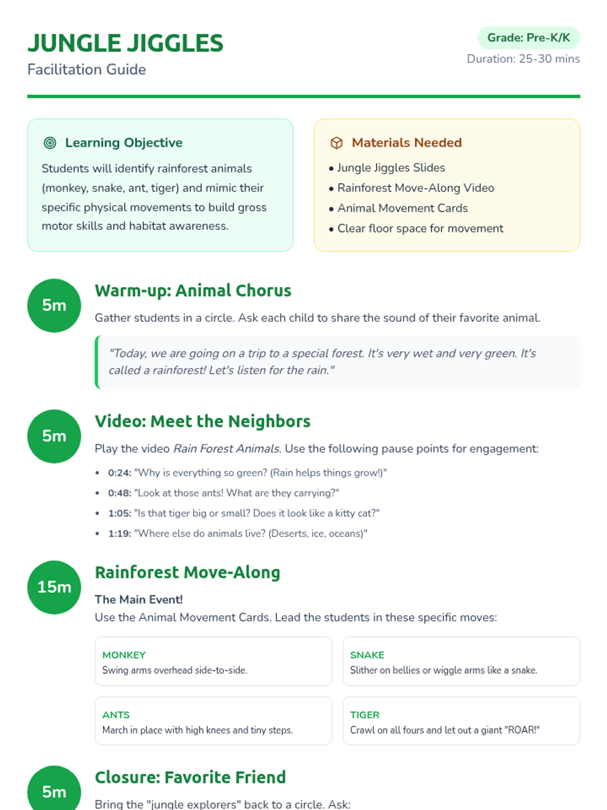 A high-energy Pre-K lesson focused on physical activity, featuring a guided video segment and a movement-based dice game to get students active and engaged.