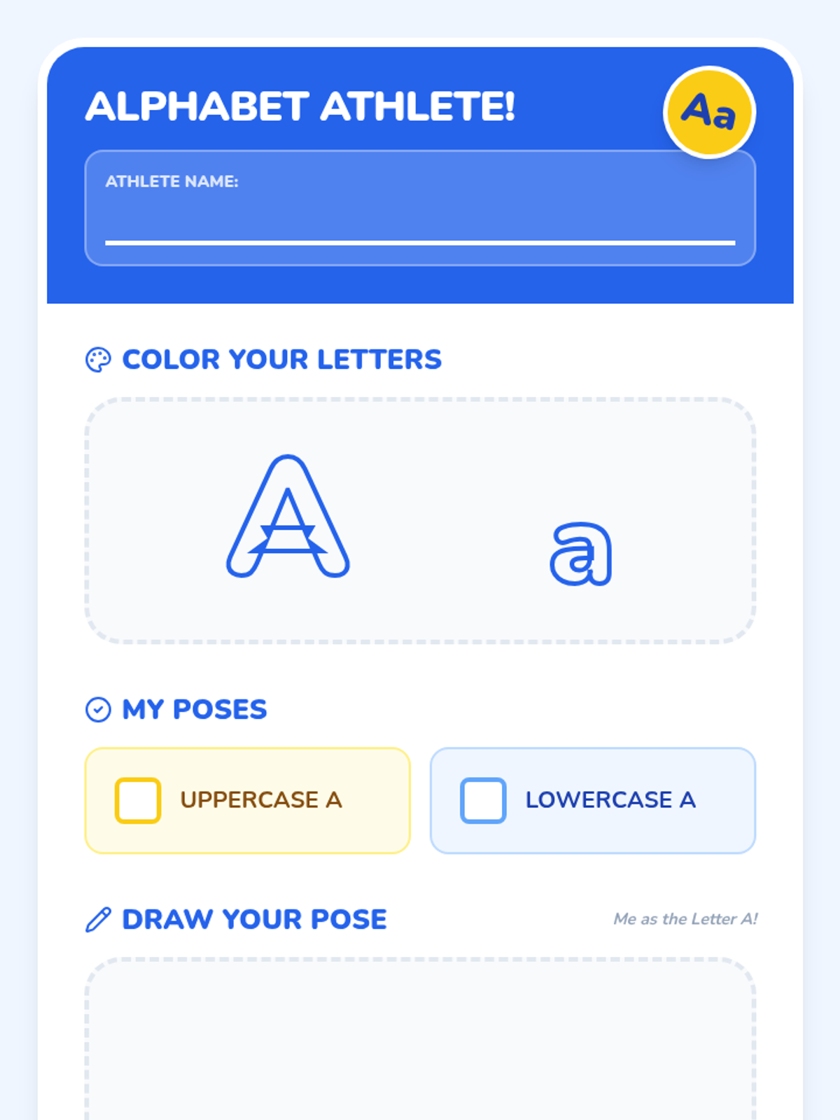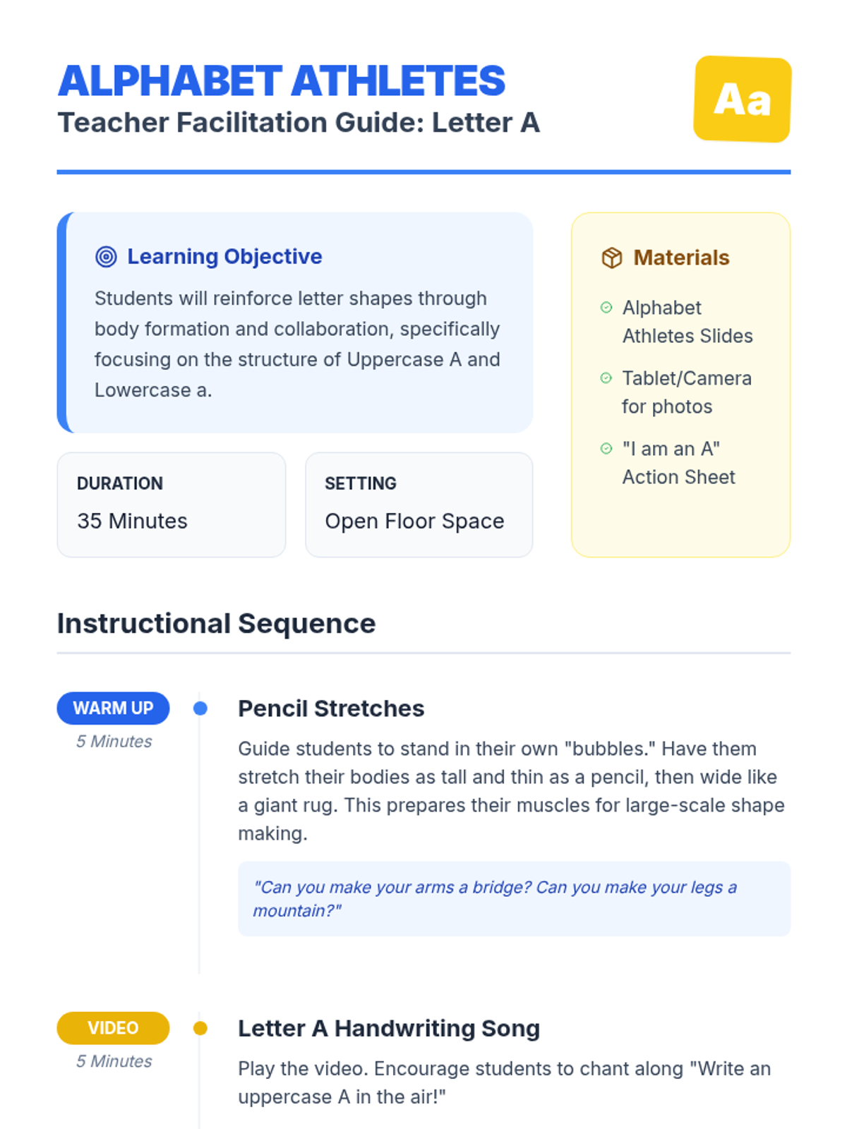 A physically active lesson where Pre-K students use their bodies to form the shapes of uppercase and lowercase 'A', reinforcing letter recognition and gross motor skills.