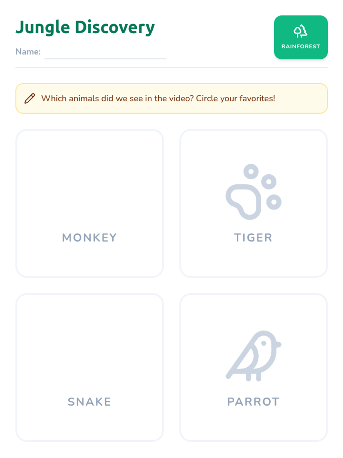 A high-energy introductory lesson for Pre-K and Kindergarten students to identify rainforest animals and explore their movements through music and video. Students will learn about the warm, wet habitat while mimicking monkeys, snakes, ants, and tigers.