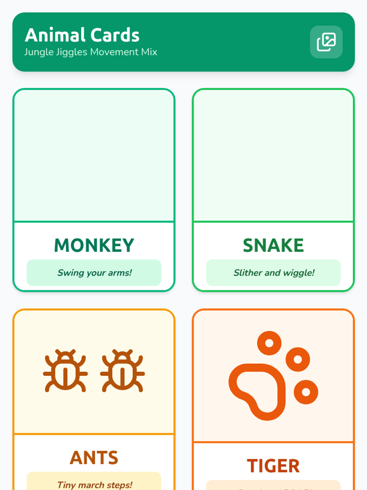 A high-energy lesson focused on gross motor skills through themed movement cards. Students mimic zoo animals and superheroes to develop coordination and body awareness.