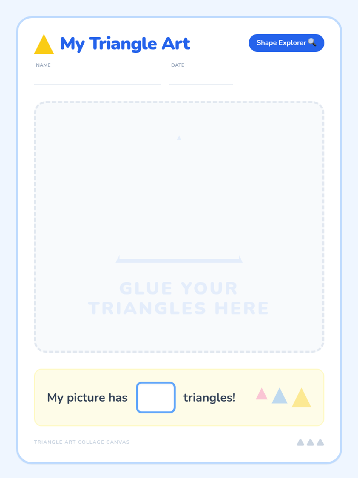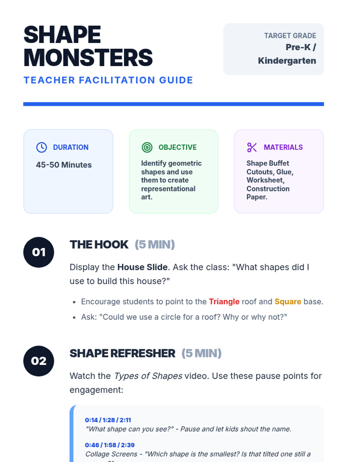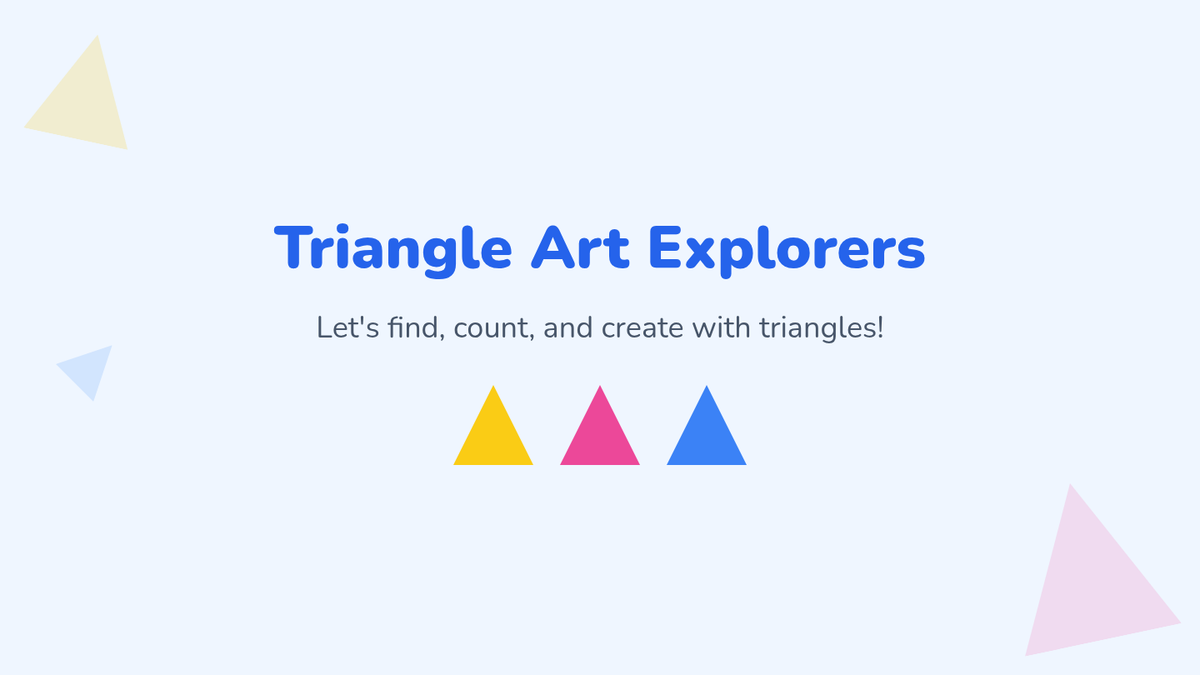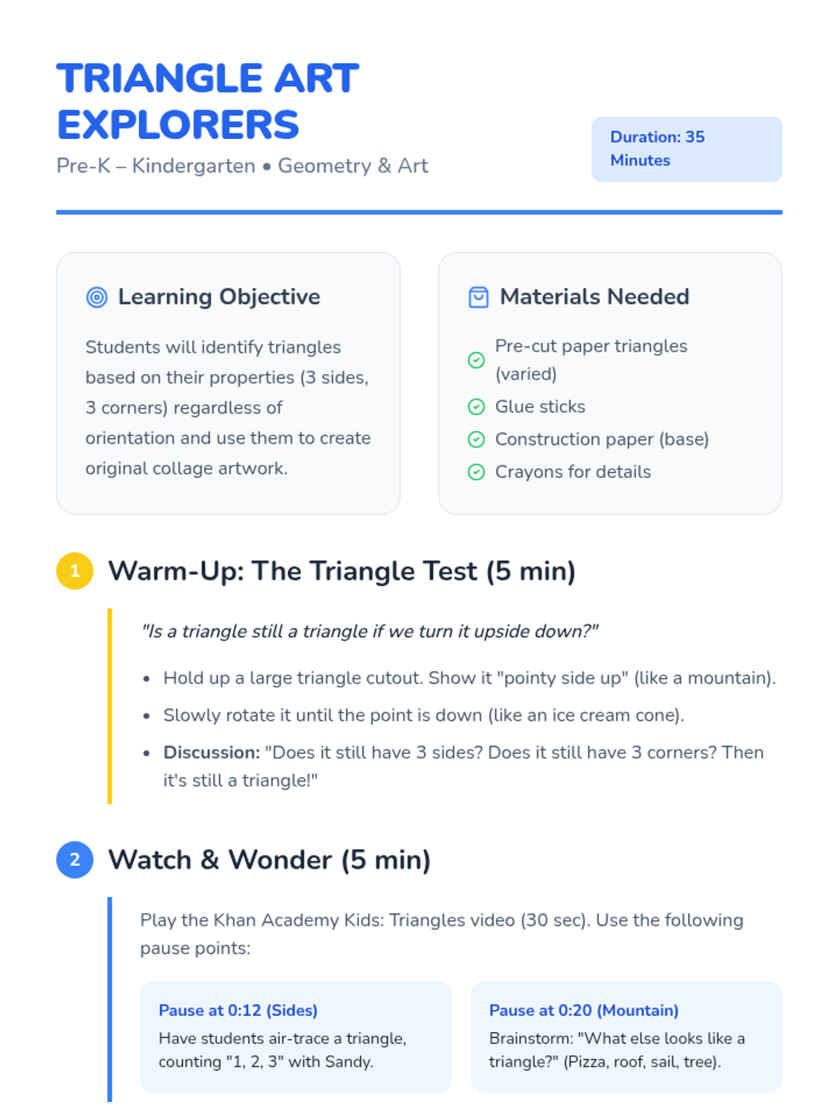 A foundational geometry lesson for Pre-K and Kindergarten students to identify and create with triangles, featuring a video-based warm-up and a creative collage activity.