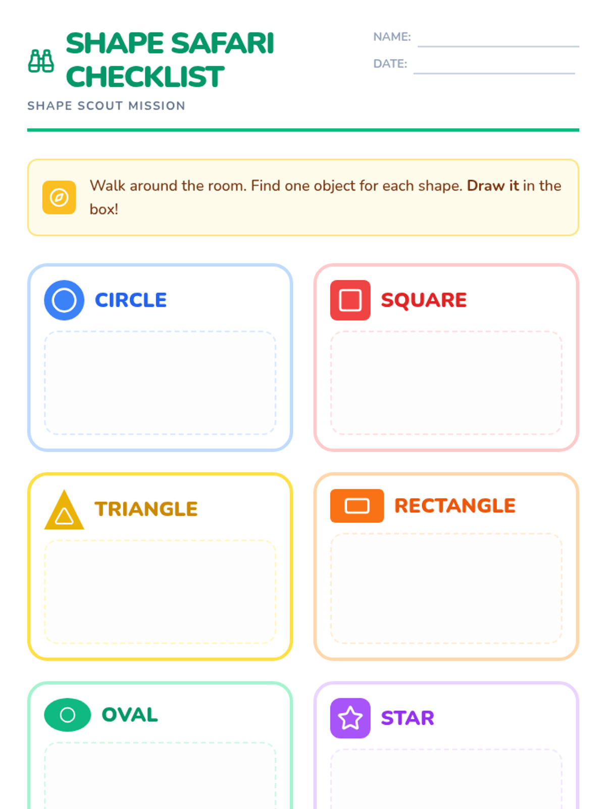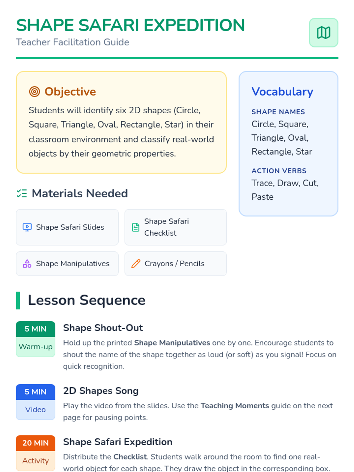 A hands-on Kindergarten lesson where students become 'Shape Scouts' to find and classify 2D shapes in their everyday environment using a catchy song and a classroom scavenger hunt.