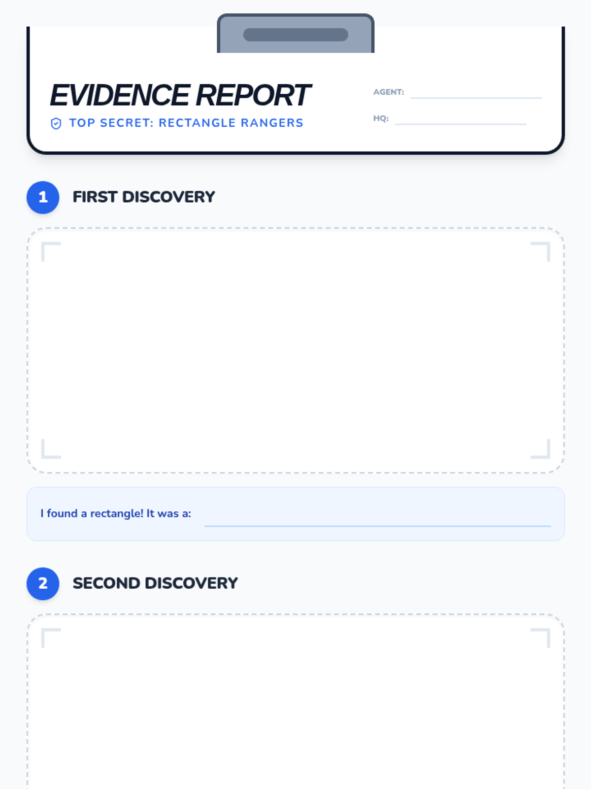 Students become Shape Detectives as they investigate the mysterious rectangle! Using their observation skills and paper magnifying glasses, they'll hunt for four-sided shapes with two long and two short sides all around their classroom.