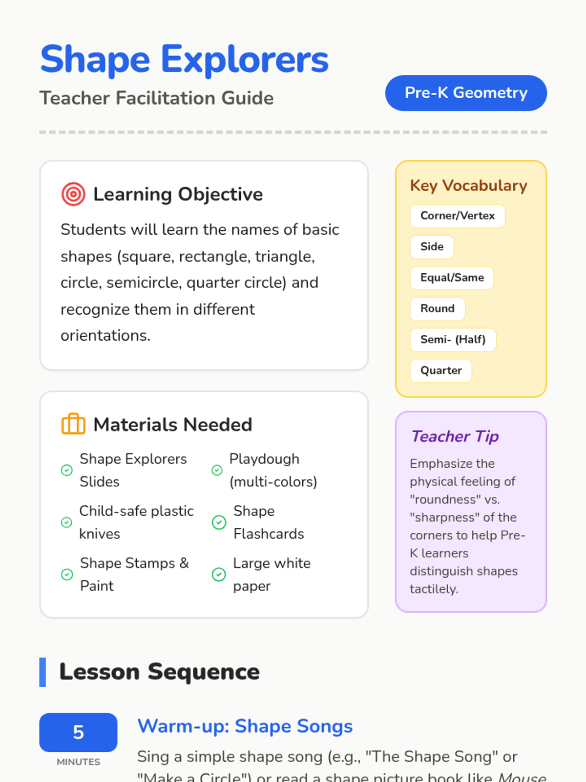 A hands-on geometry lesson for Pre-K students to identify, describe, and create basic shapes including squares, rectangles, triangles, circles, semicircles, and quarter circles.