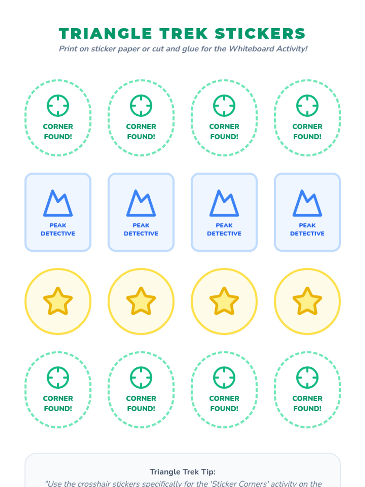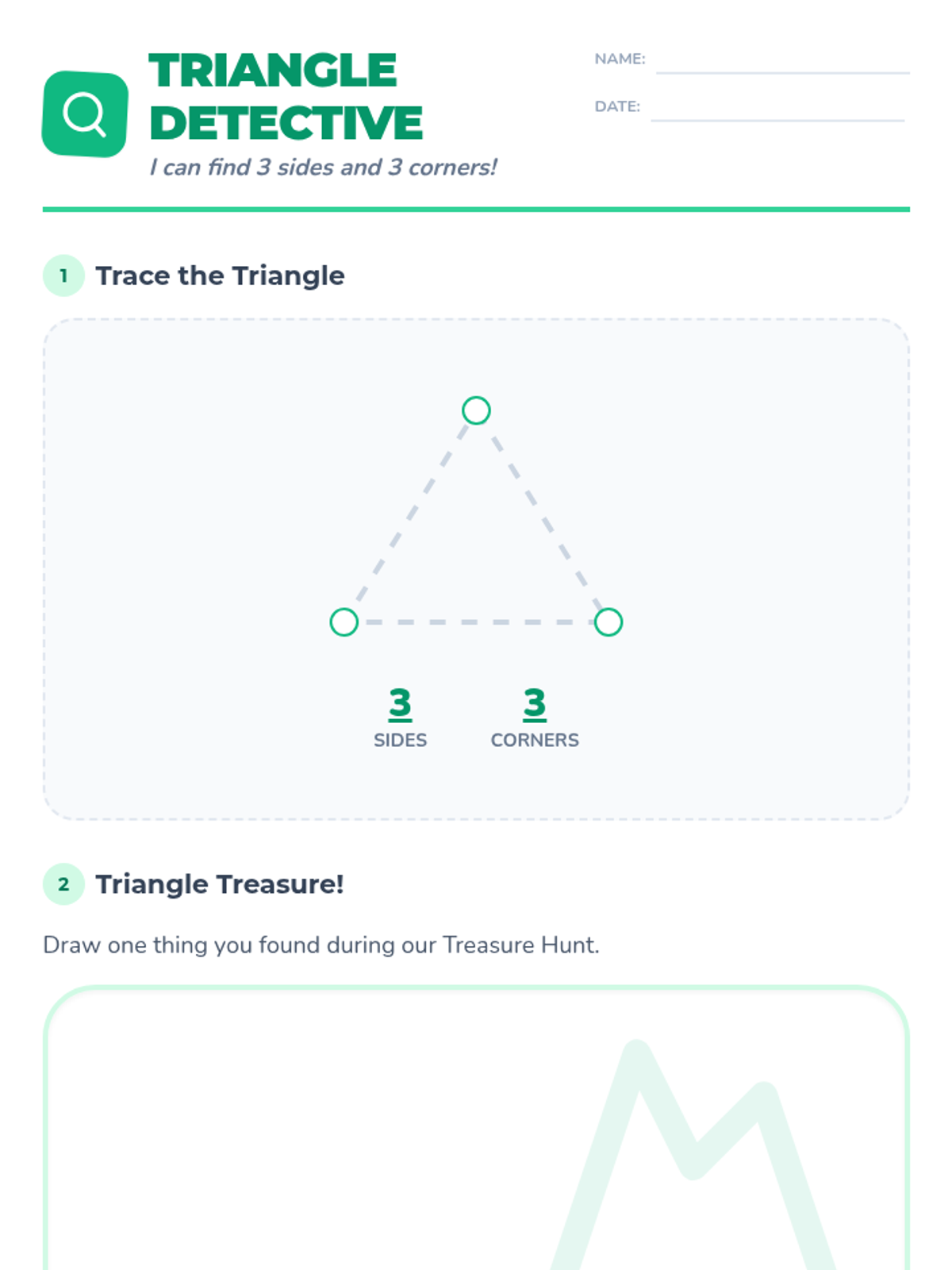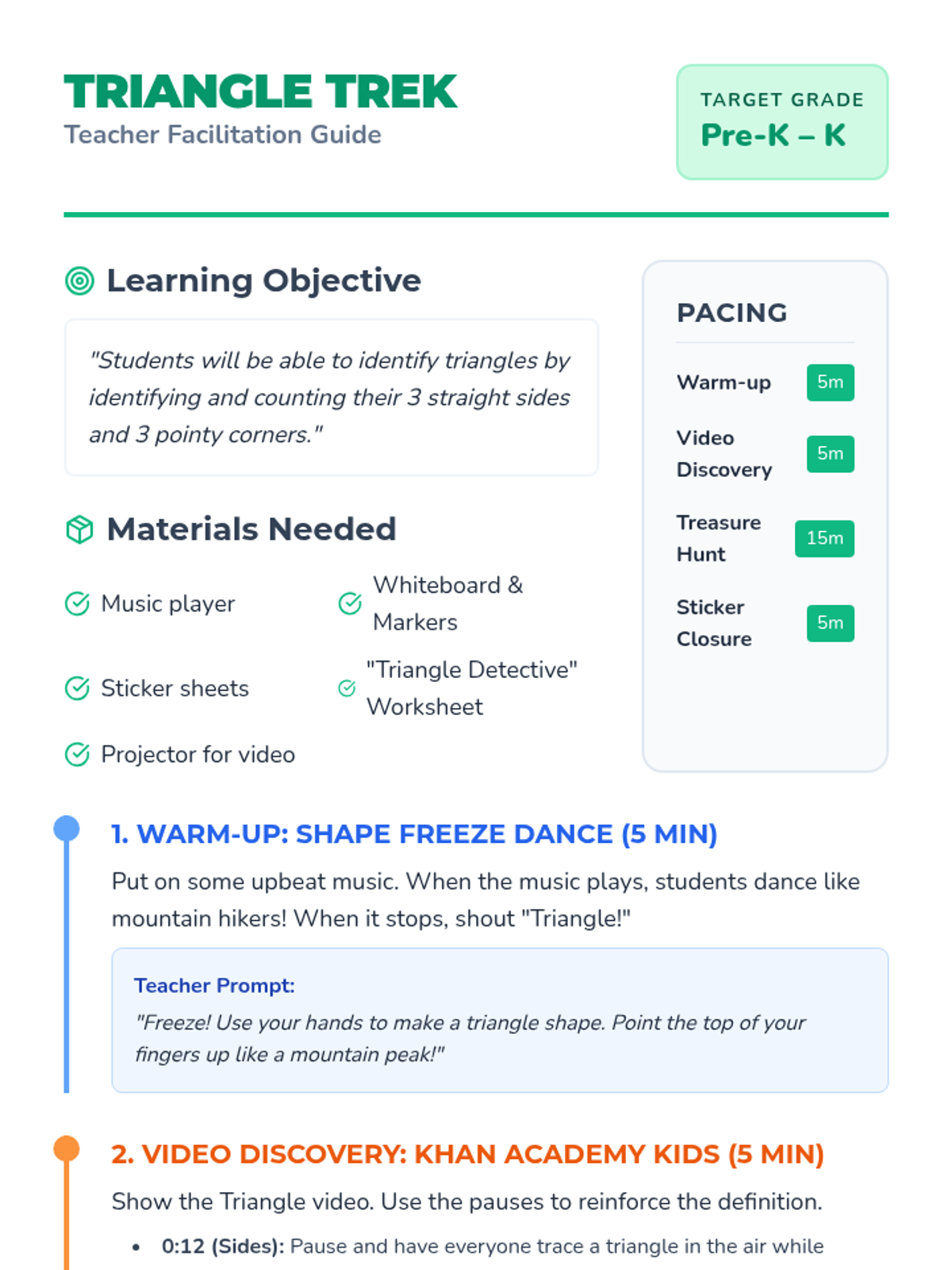 Students will become 'Triangle Trekkers' as they identify triangles by counting 3 sides and 3 corners through a freeze dance, a guided video observation, and a classroom treasure hunt.