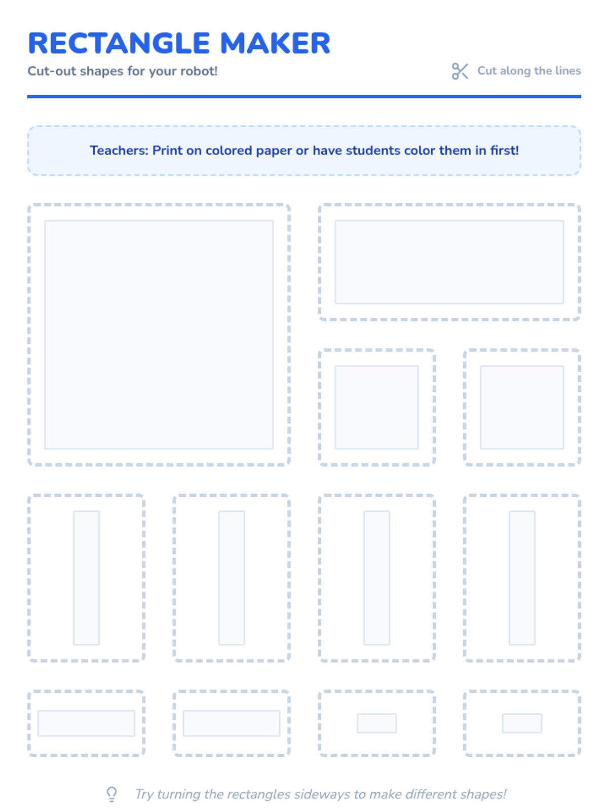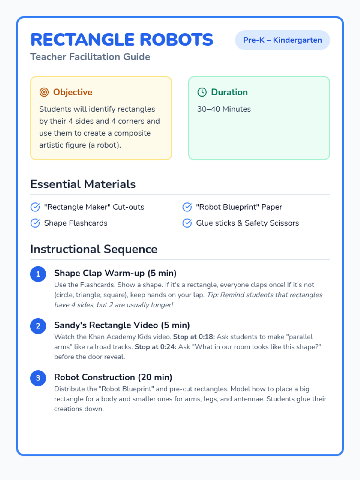 A hands-on geometry and art lesson where Pre-K and Kindergarten students identify rectangles and use them to construct creative 'Rectangle Robots.' Students learn to distinguish rectangles by their four sides and corners through a movement-based warm-up, a video exploration, and a tactile building activity.