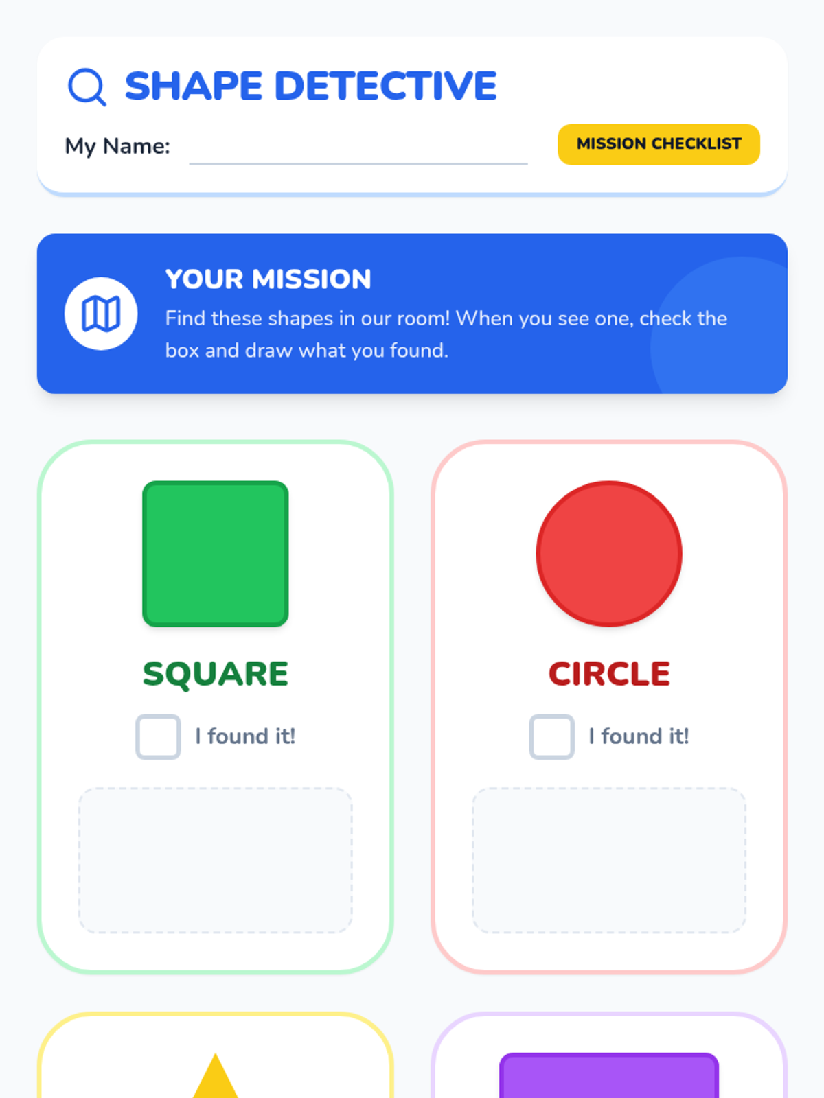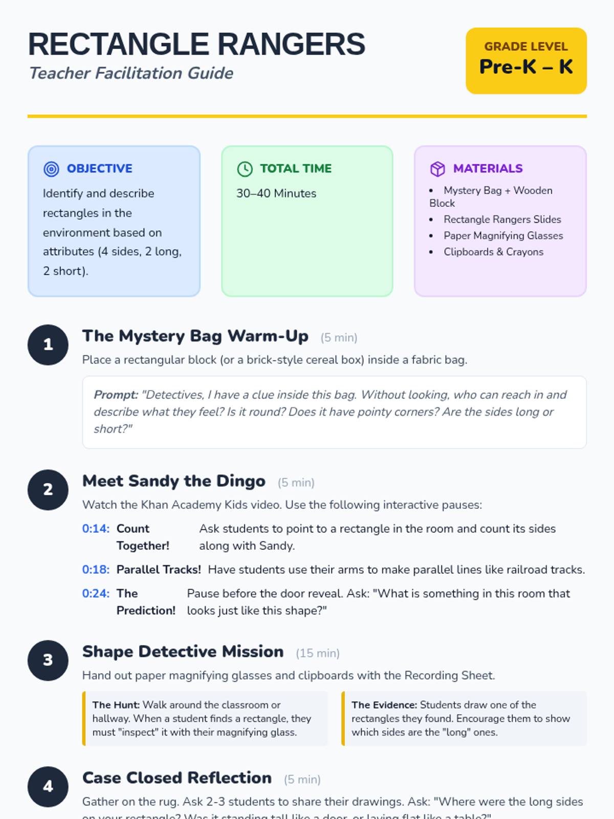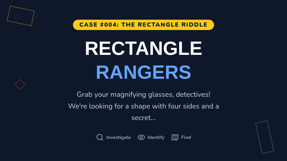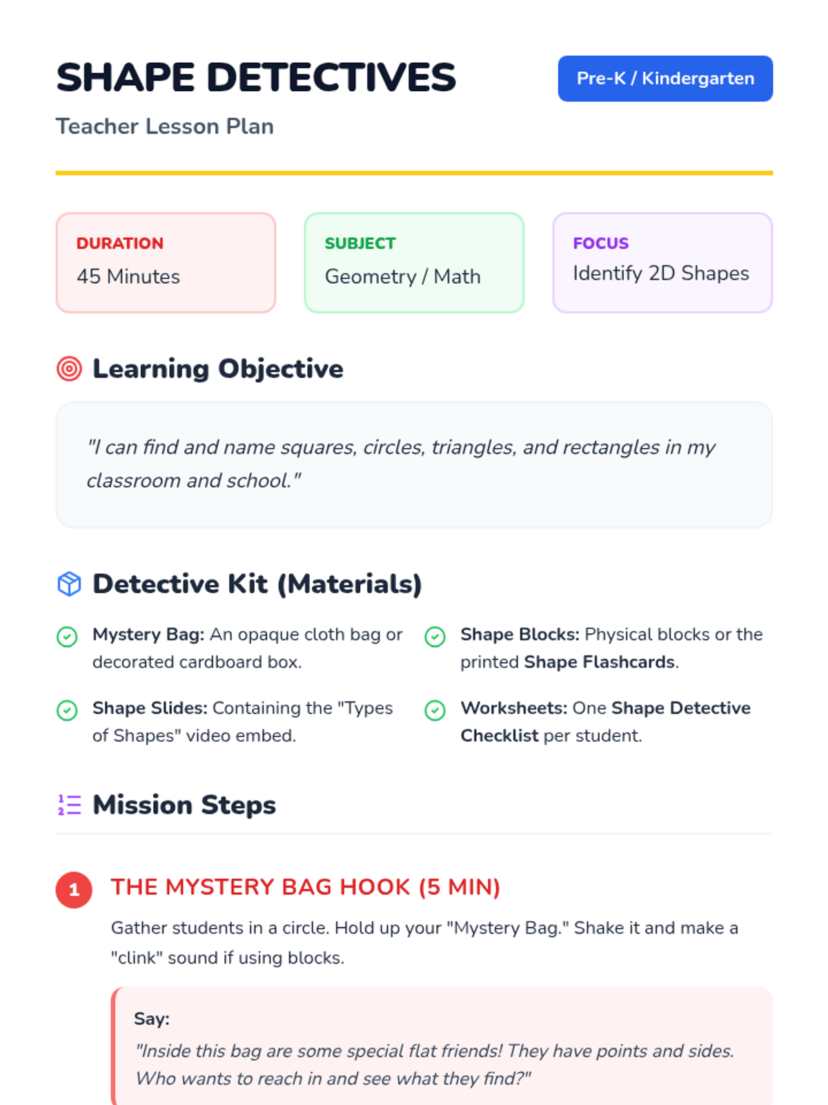 A fun, interactive lesson where Pre-K and Kindergarten students become 'Shape Detectives' to identify circles, triangles, squares, and rectangles by counting their sides and finding them in the real world.