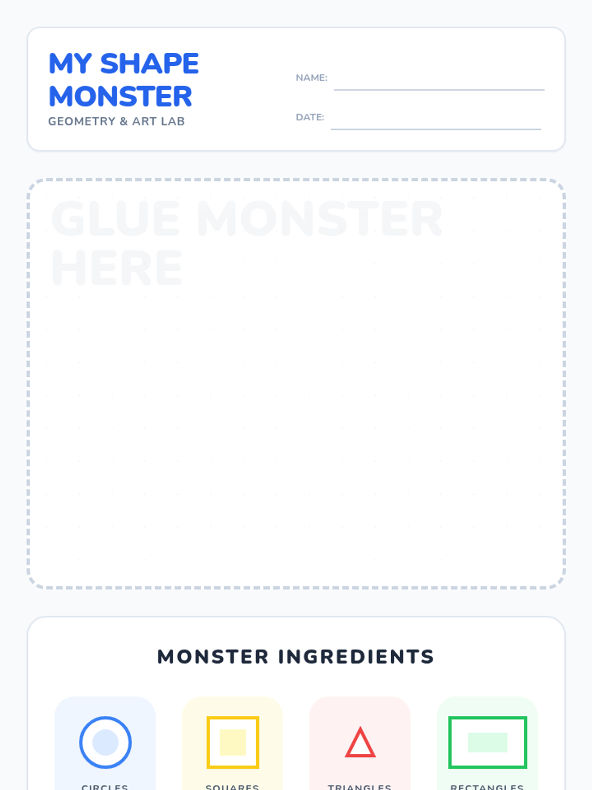 A hands-on geometry lesson where Pre-K and Kindergarten students identify squares, circles, triangles, and rectangles to build their own unique shape monsters while practicing counting and descriptive language.