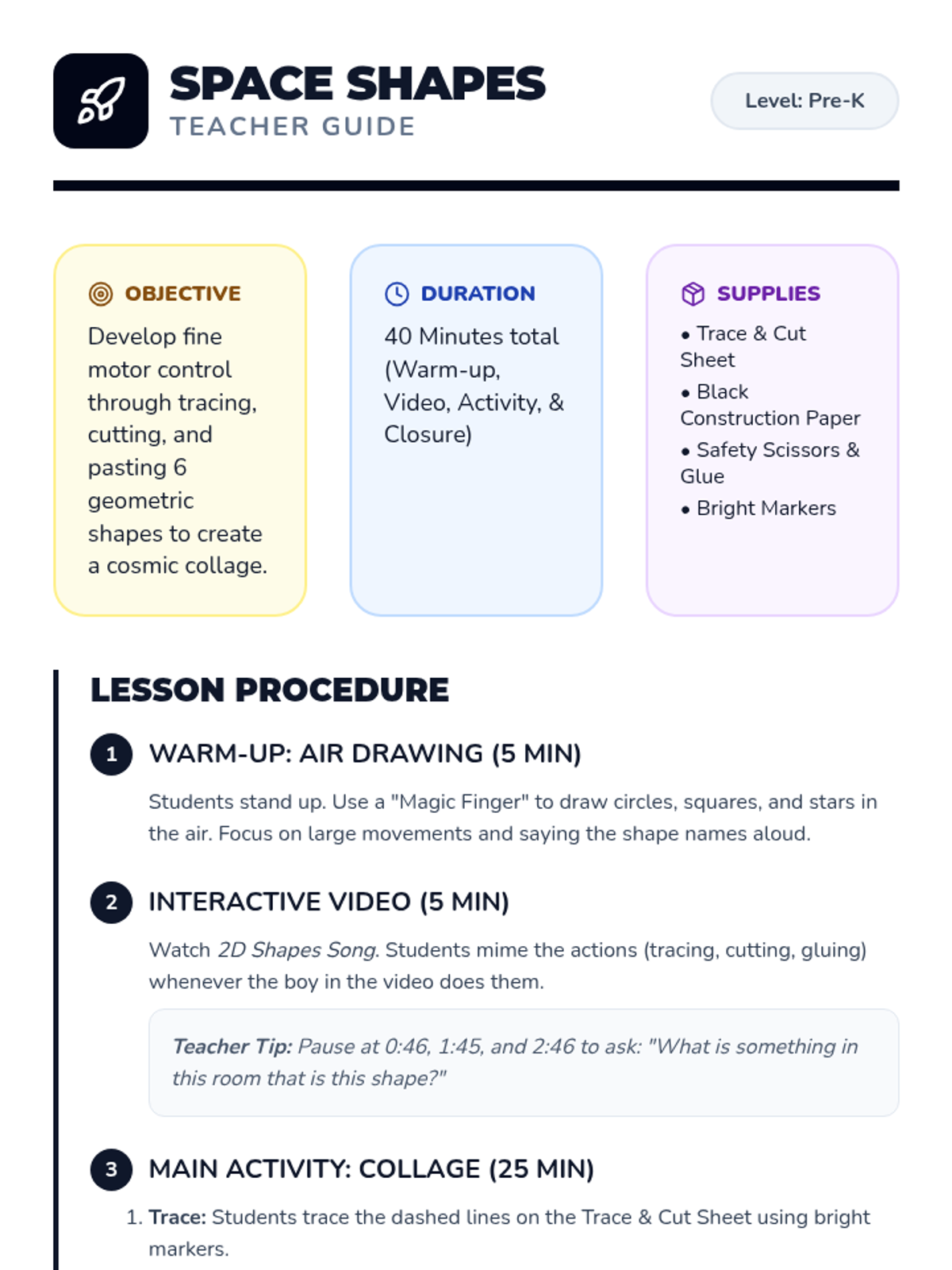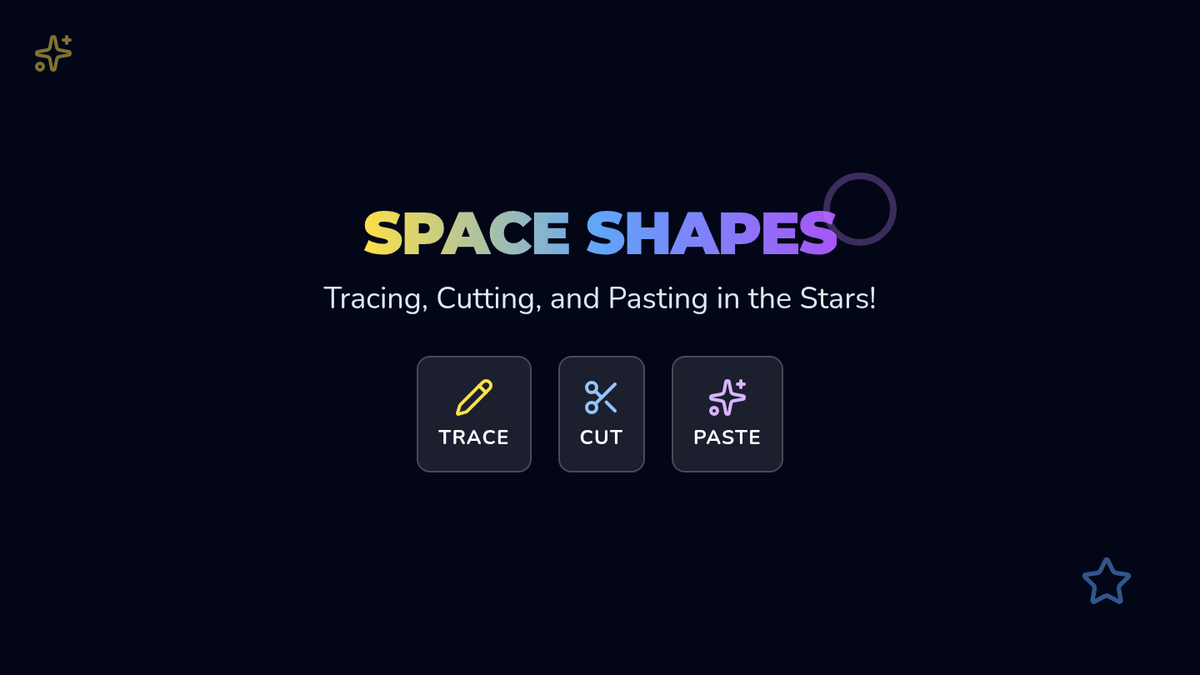 A Pre-K lesson focused on developing fine motor skills through tracing, cutting, and pasting 2D shapes to create a cosmic collage. Students engage with a catchy song and movement-based 'air drawing' before creating their own space-themed artwork.