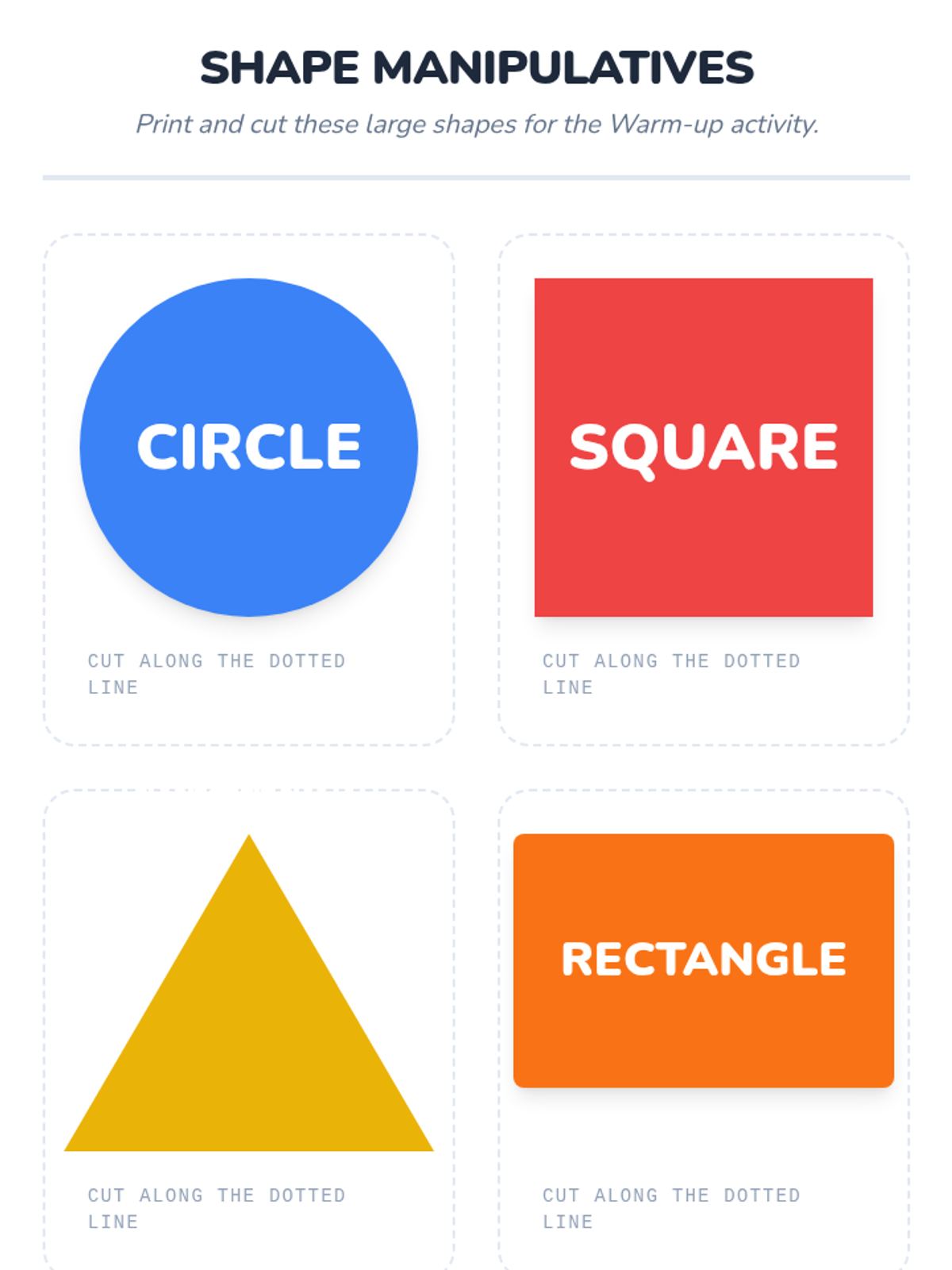 A fun, hands-on introduction to squares, circles, triangles, and rectangles for Pre-K and Kindergarten students. Students will use a video guide and a classroom "Shape Hunt" to identify shapes in their everyday environment.