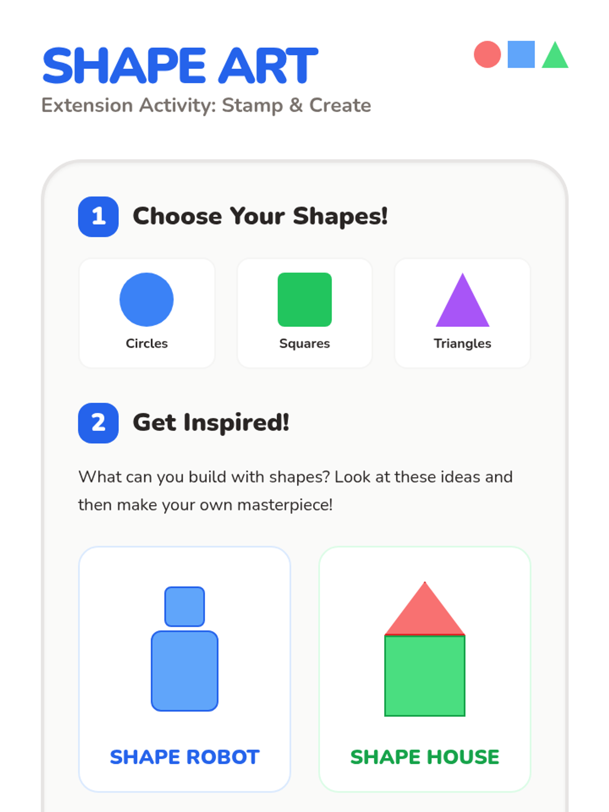 A hands-on lesson for K-1 students to identify, extend, and create 2D shape patterns with three levels of differentiated activity mats.