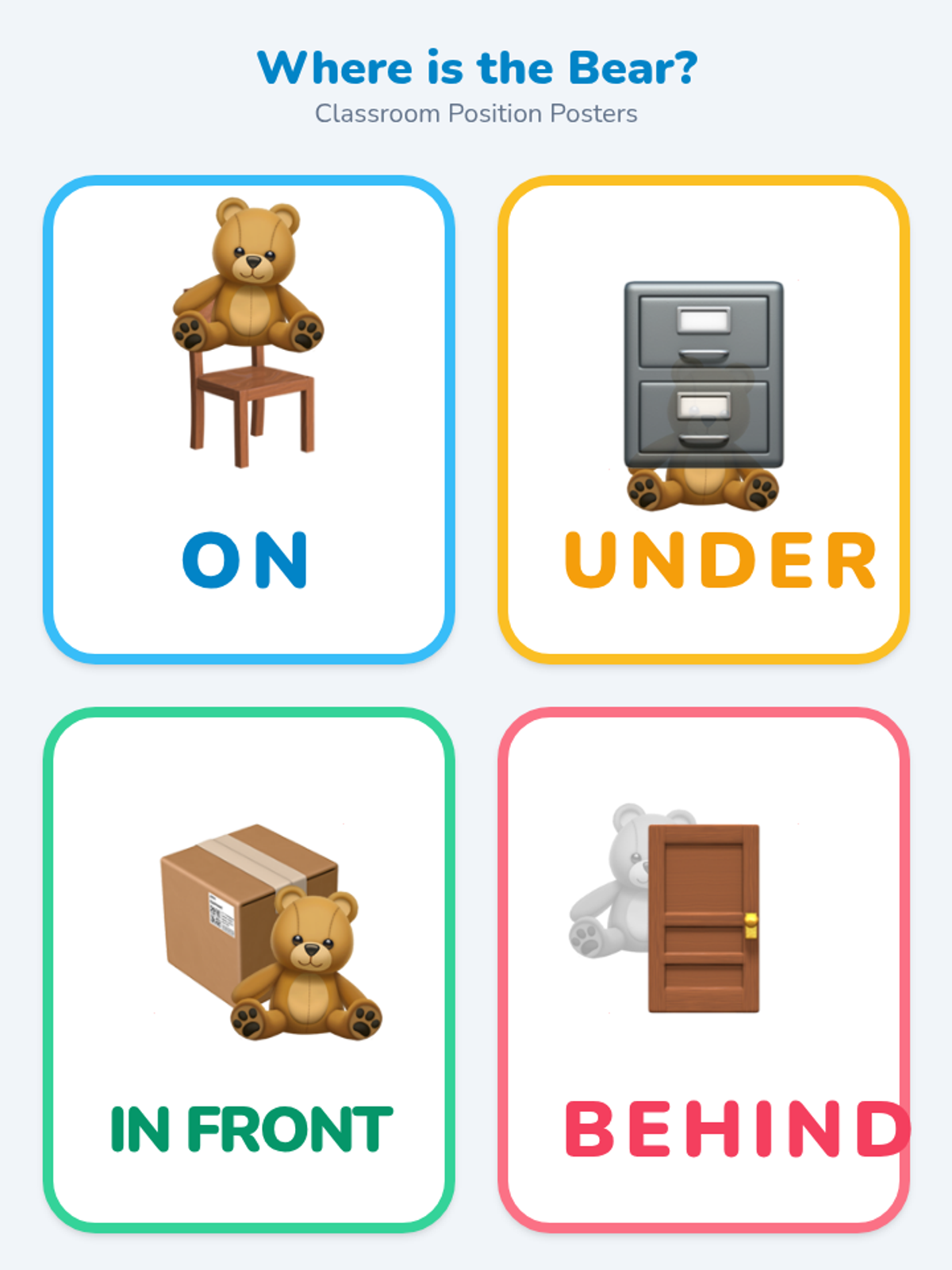 A high-energy, interactive lesson for Pre-K students to learn positional words using a class mascot and classroom exploration. Students will identify and describe where a teddy bear is located using complete sentences.