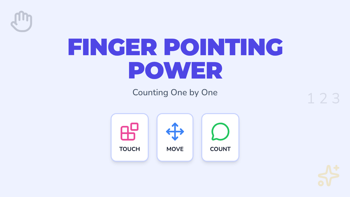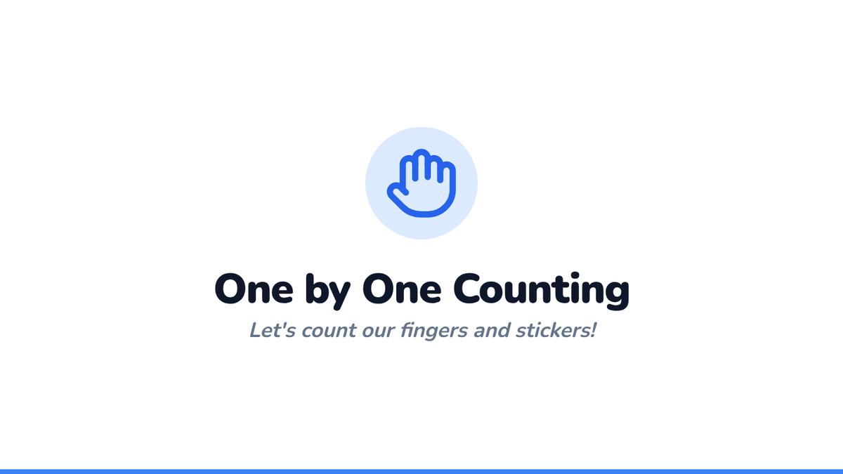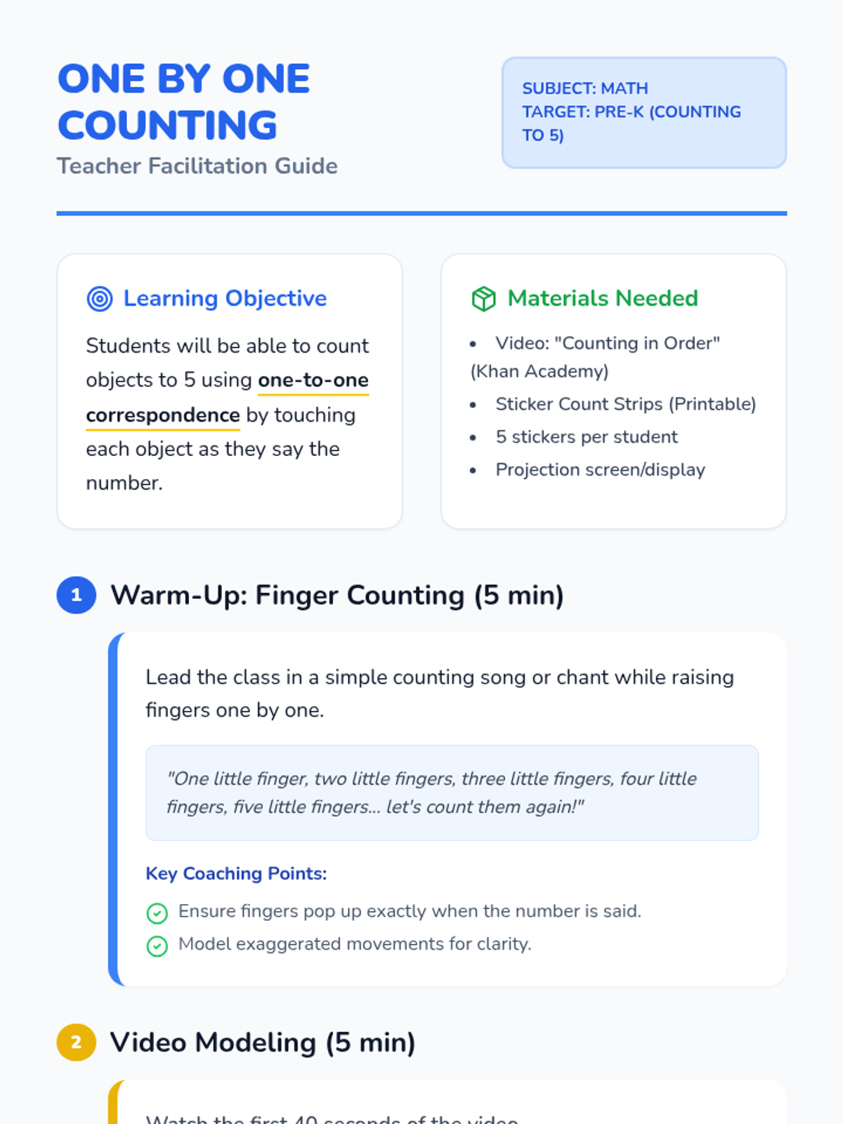 A foundational Pre-K math lesson focused on one-to-one correspondence for numbers 1-5 using finger play, video modeling, and tactile sticker counting.