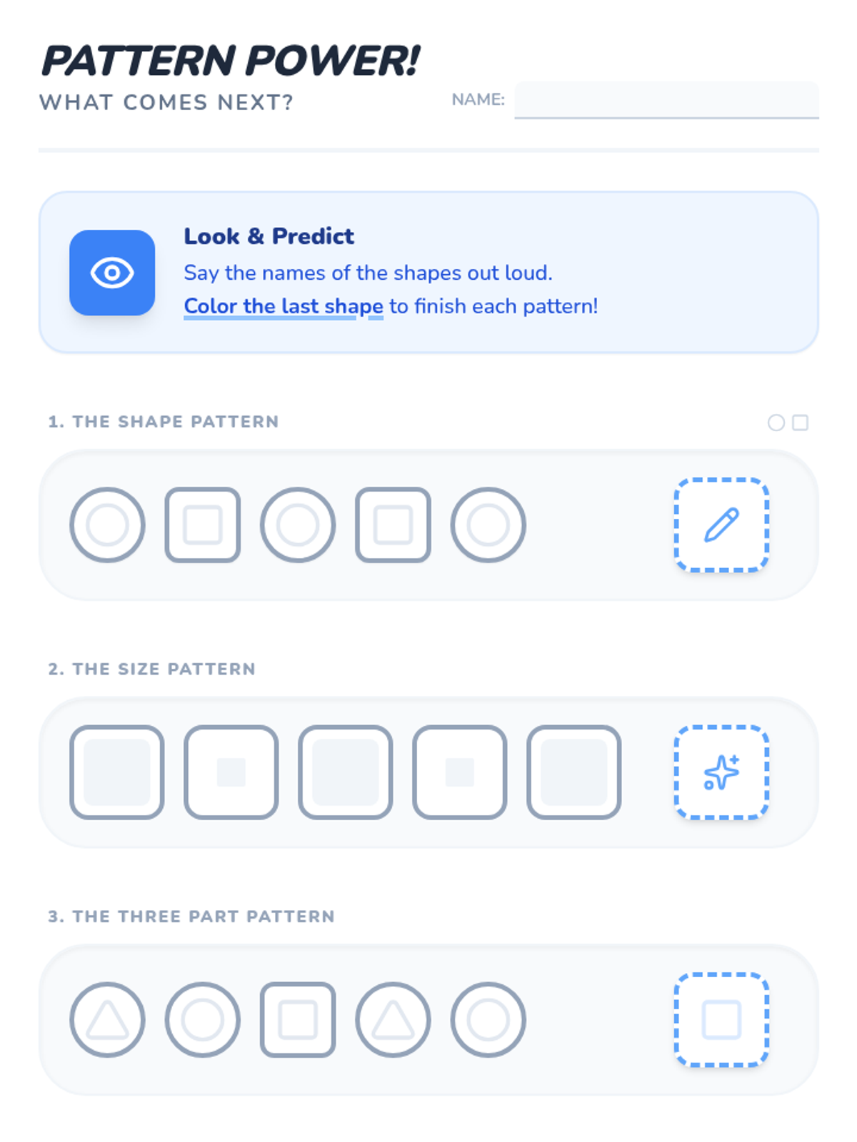 Patterns and RelationshipsIdentification, extension, and creation of repeating and growing patterns using shapes, colors, and numbers. Develops algebraic thinking by analyzing sequences and defining functional relationships between variables.