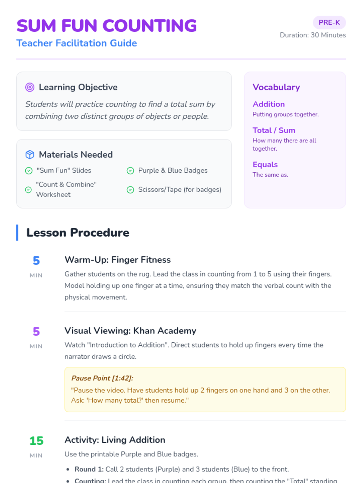 A Pre-K lesson introducing the concept of addition through counting. Students use fingers, physical movement ('Living Addition'), and a visual video guide to understand how combining two groups creates a total sum.