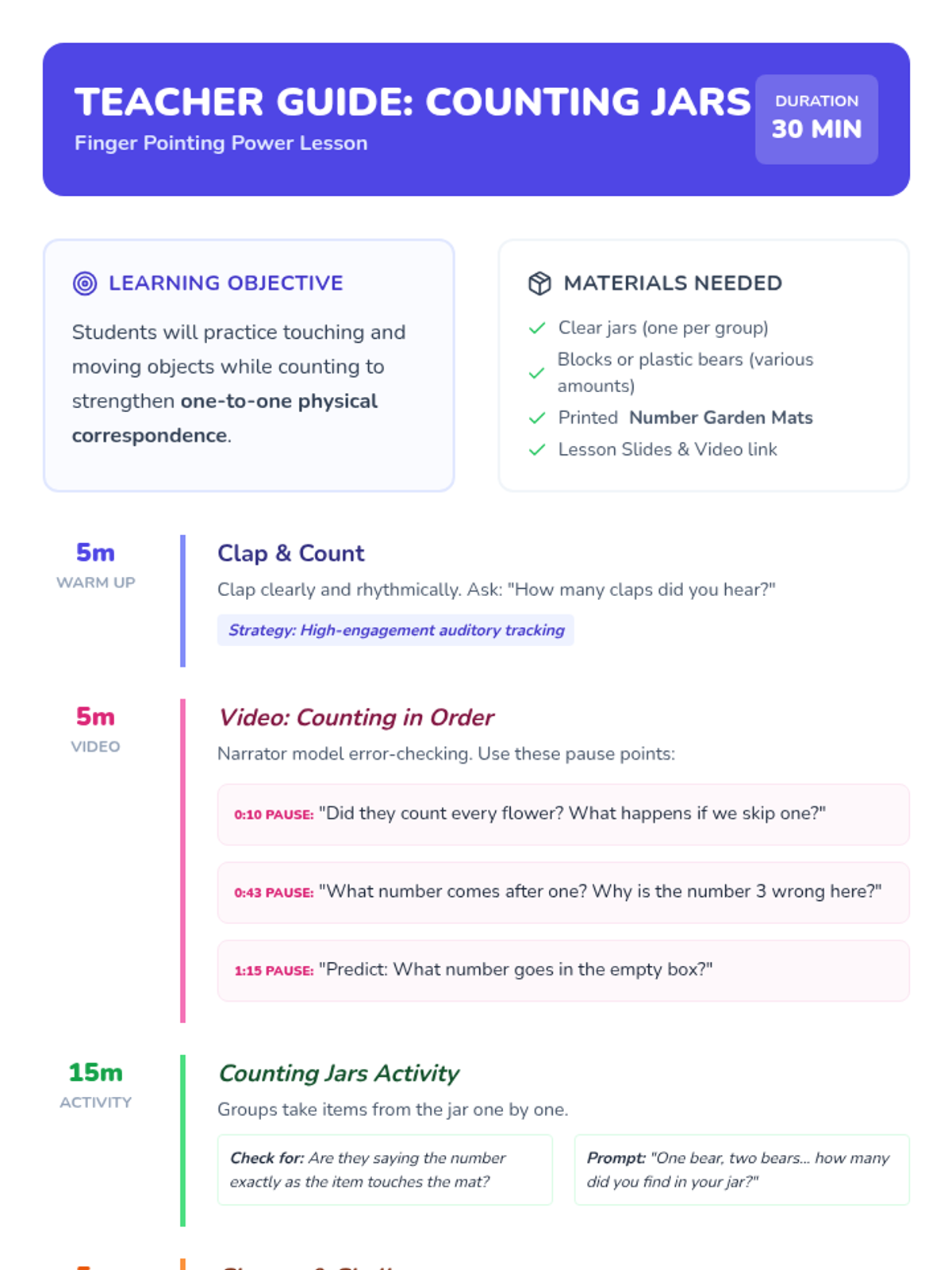 A hands-on lesson for Pre-K students to master one-to-one correspondence by touching and moving objects while counting. Includes a video-guided discussion and a tactile jar-sorting activity.