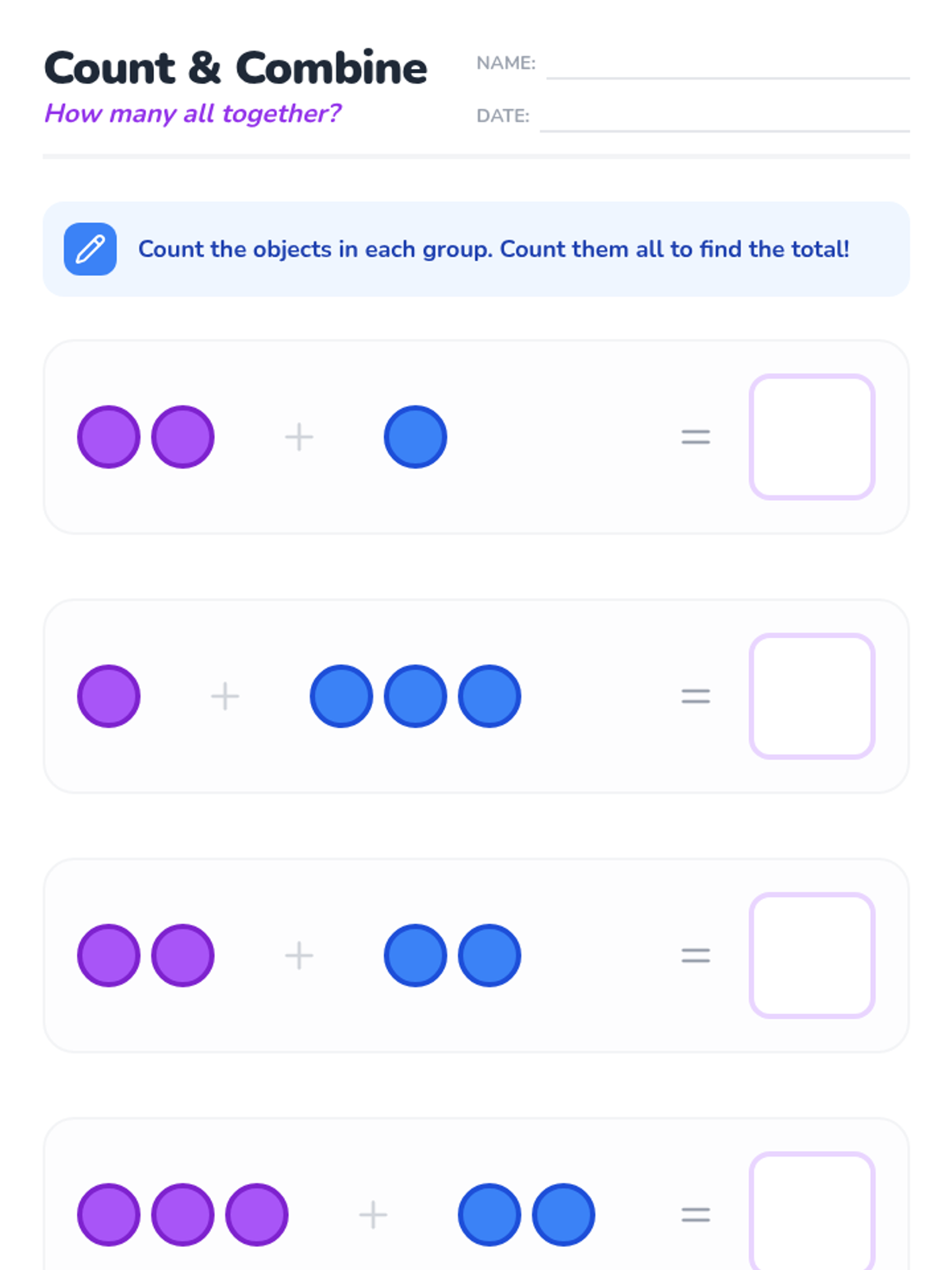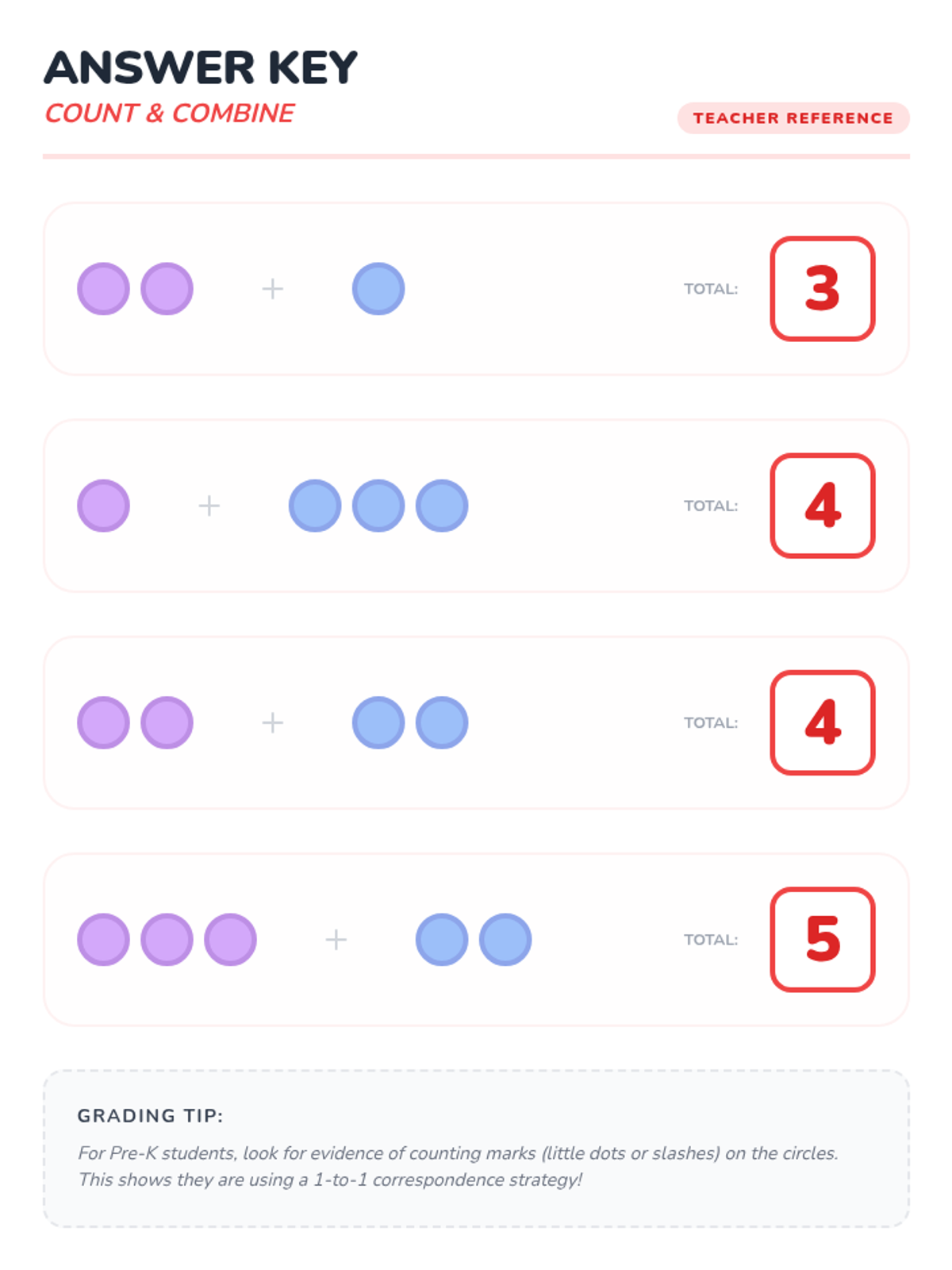 A foundational counting lesson for Pre-K and Kindergarten students focused on one-to-one correspondence and the concept of addition by 'putting together' sets.