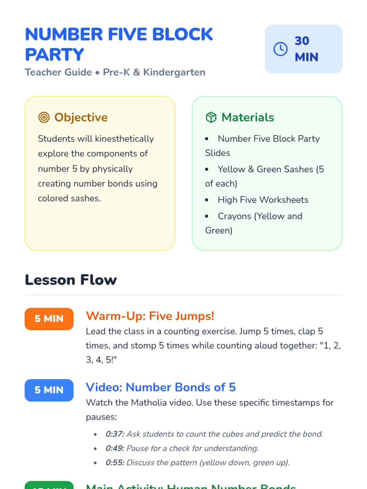 A kinesthetic lesson for Pre-K and Kindergarten students to explore the number bonds of 5 using movement, a video, and human modeling. Students use yellow and green sashes to physically represent different pairs that make five.