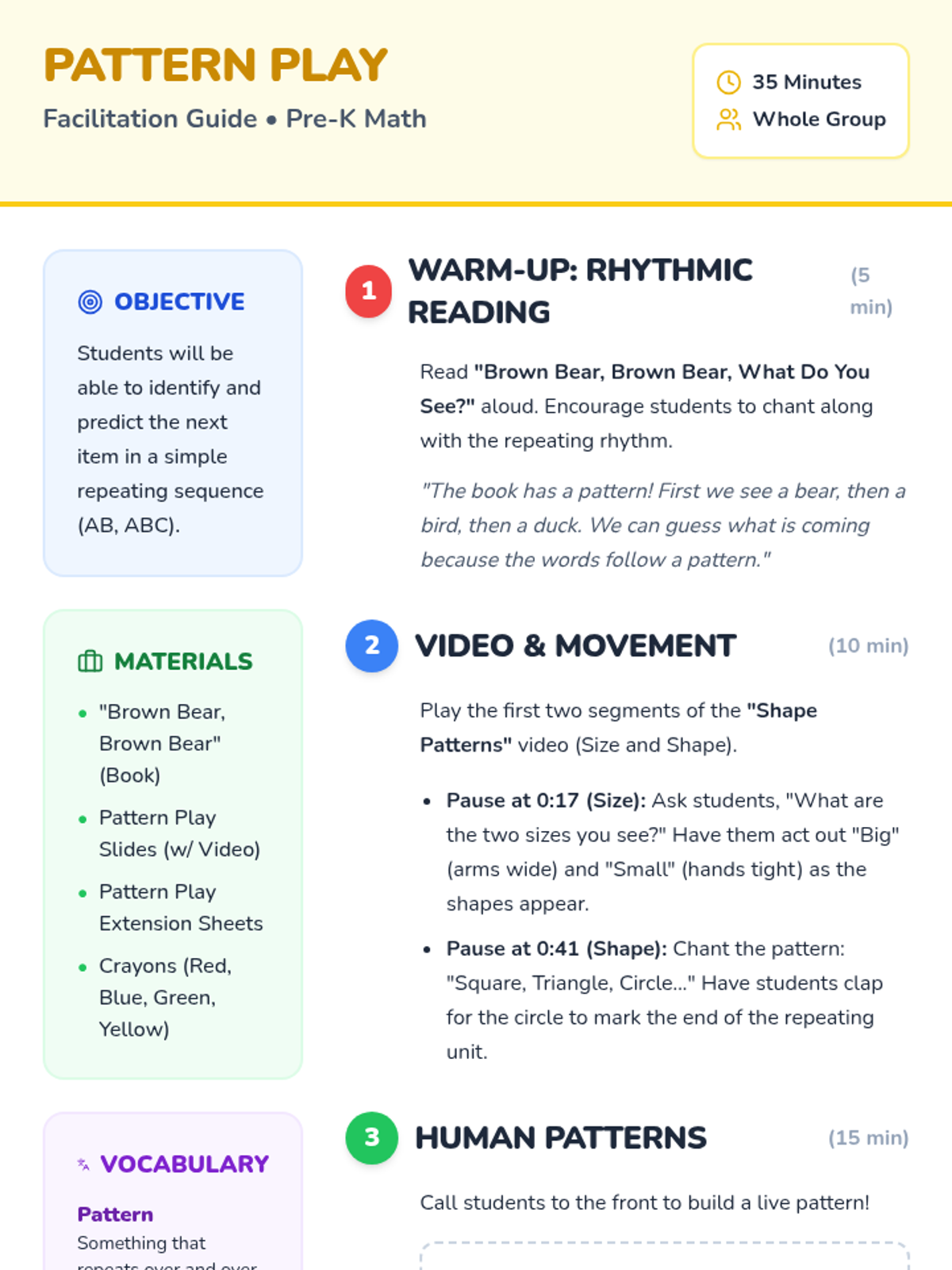 An engaging Pre-K lesson that combines foundational math skills with artistic exploration. Students will practice counting, sorting by color and shape, and creating simple patterns using crayons, blocks, and stamps.
