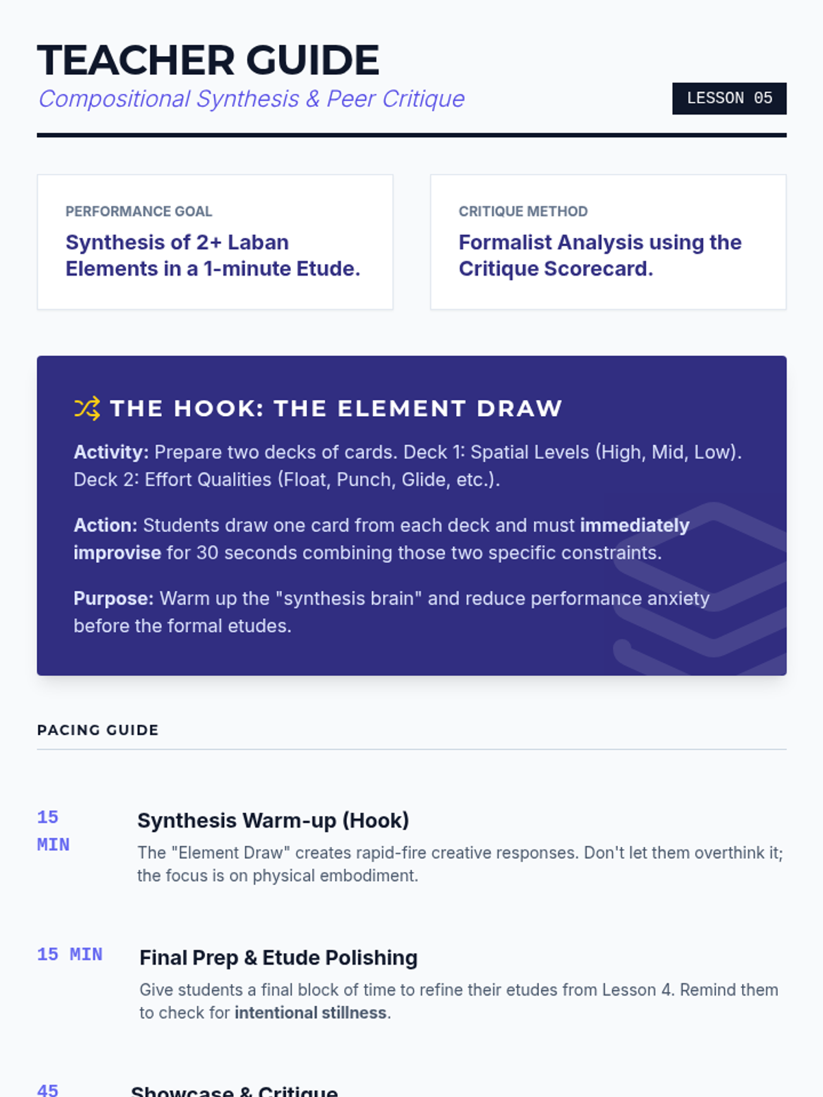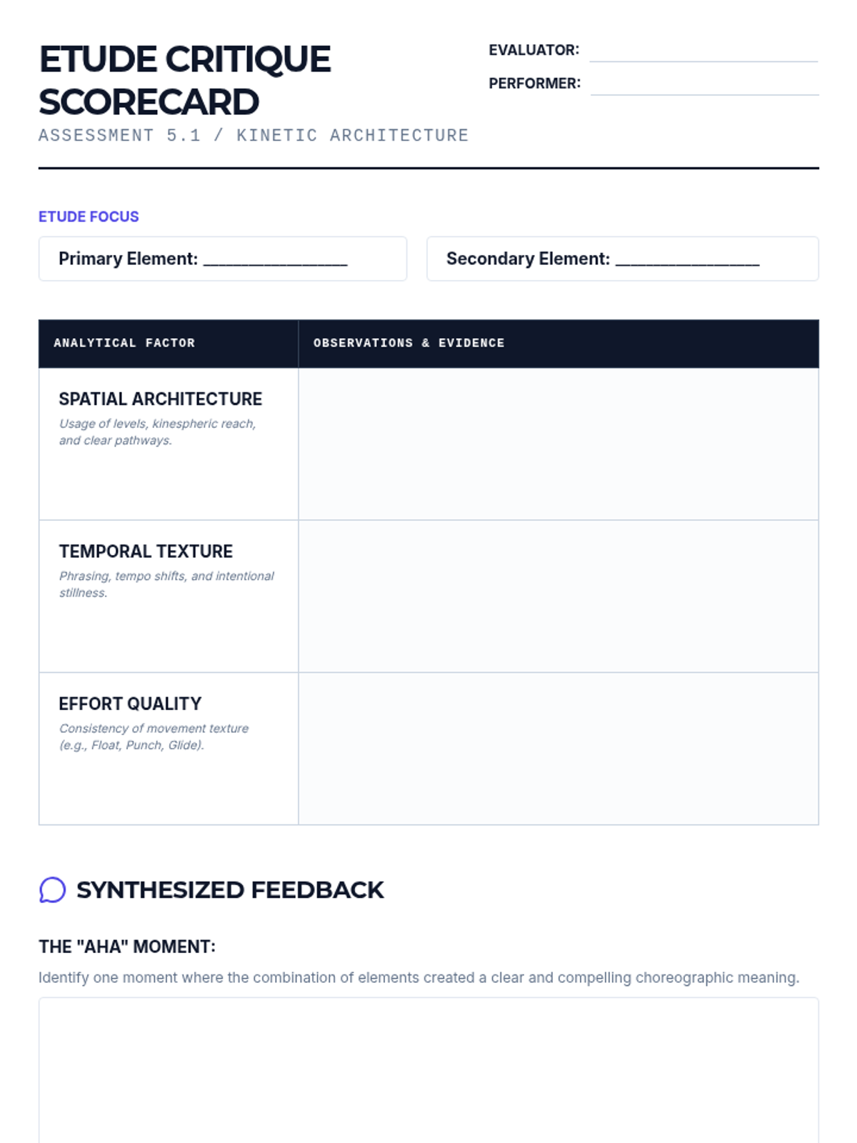 A culminating compositional study where students synthesize dance elements into short etudes and engage in peer critique.