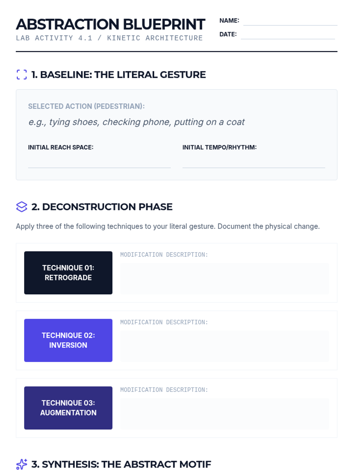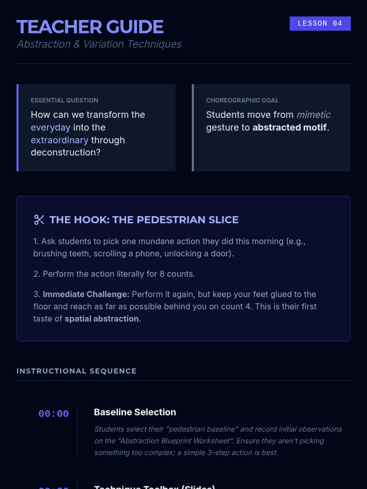 Students apply choreographic devices such as retrograde and inversion to abstract literal gestures into sophisticated movement motifs.