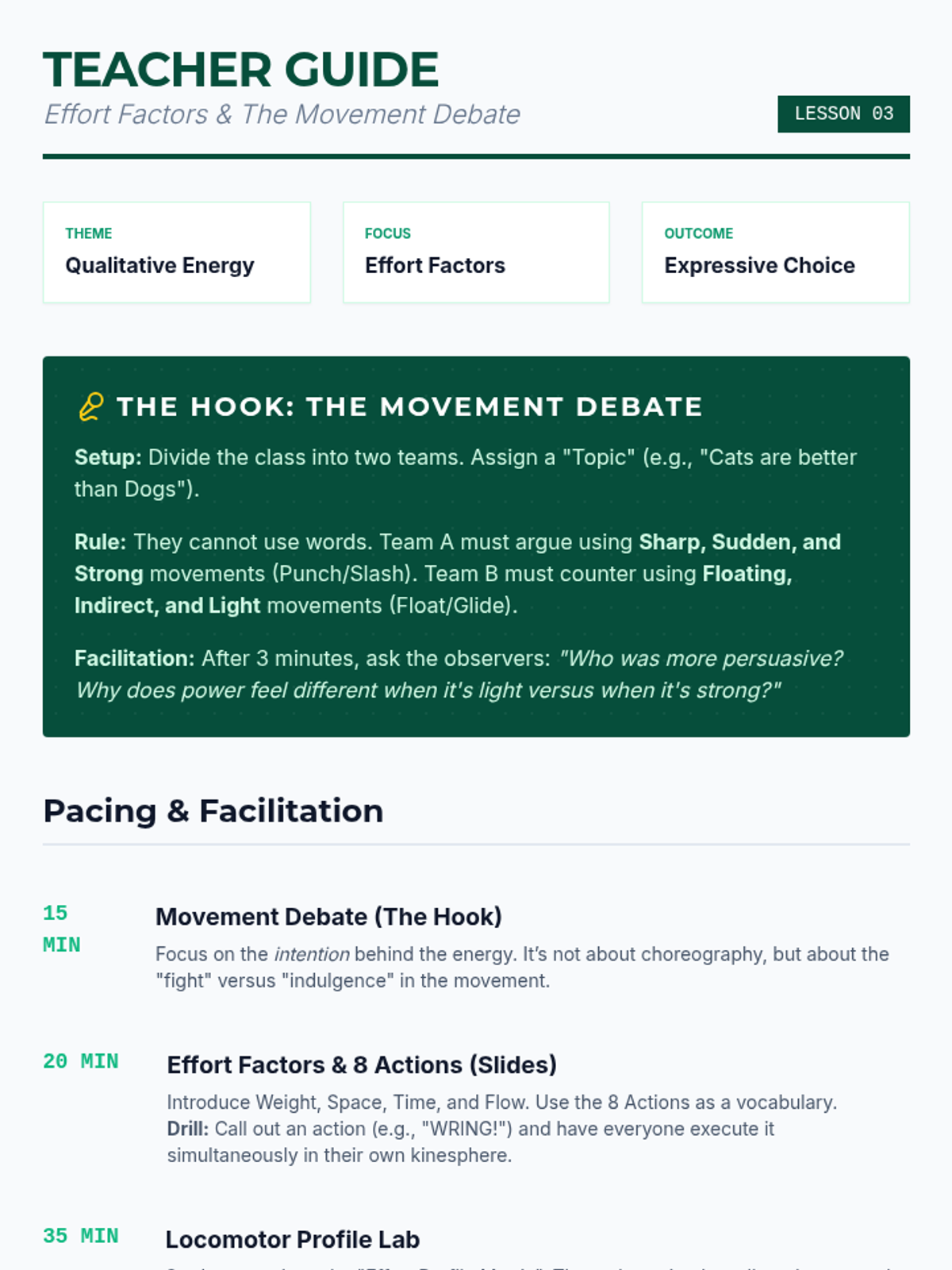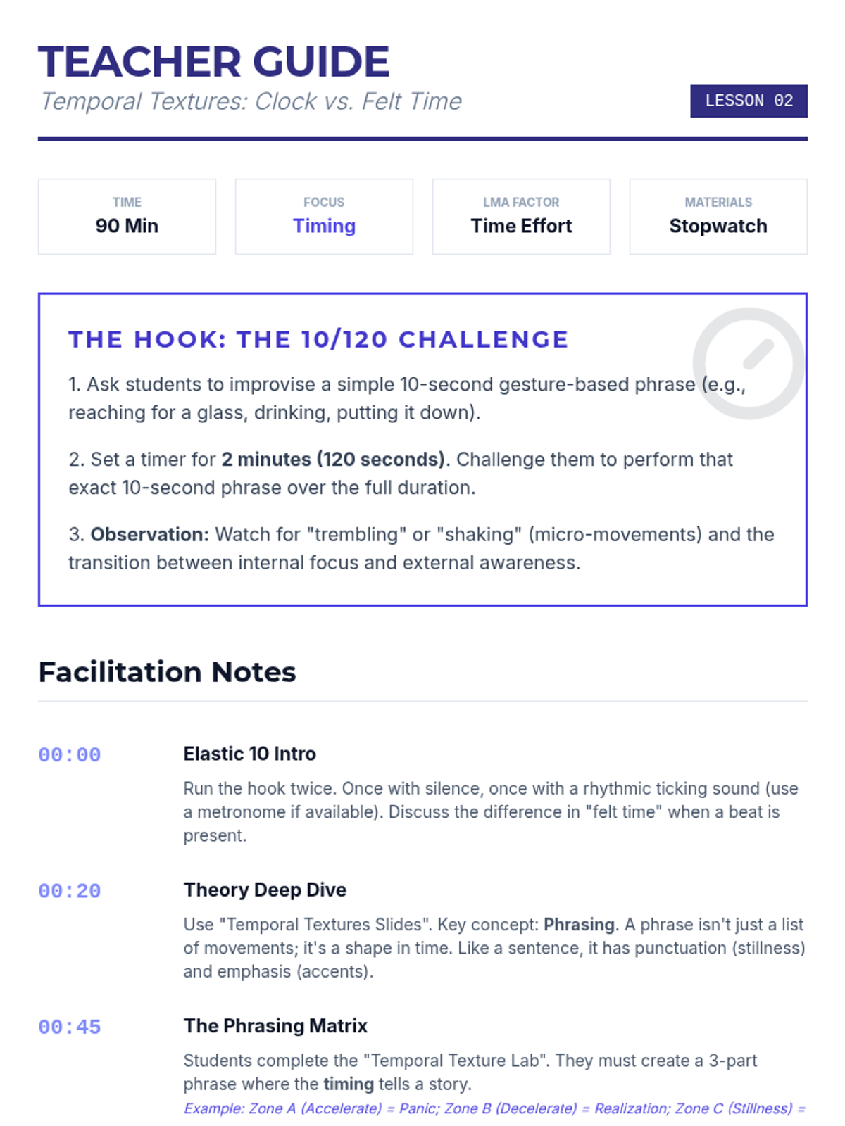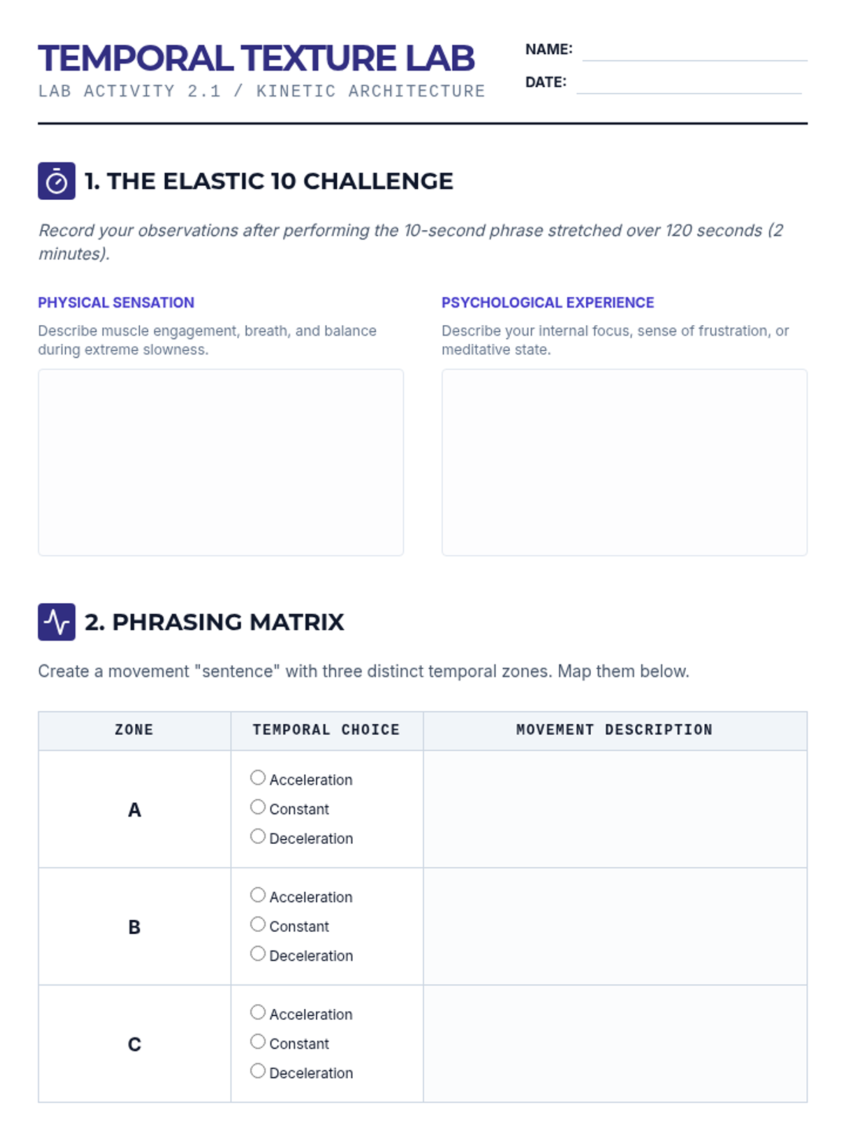 Students take a single movement and perform it over 1 count, 4 counts, and 8 counts. They analyze how the muscular tension and quality of movement change based on the duration allowed.