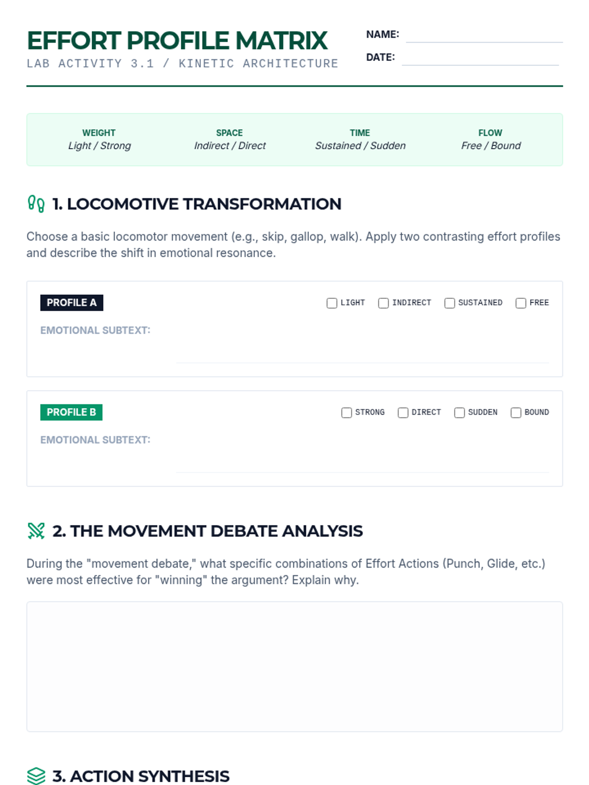 An introduction to Laban Effort factors, focusing on movement qualities like weight, flow, and directness to convey emotional context.