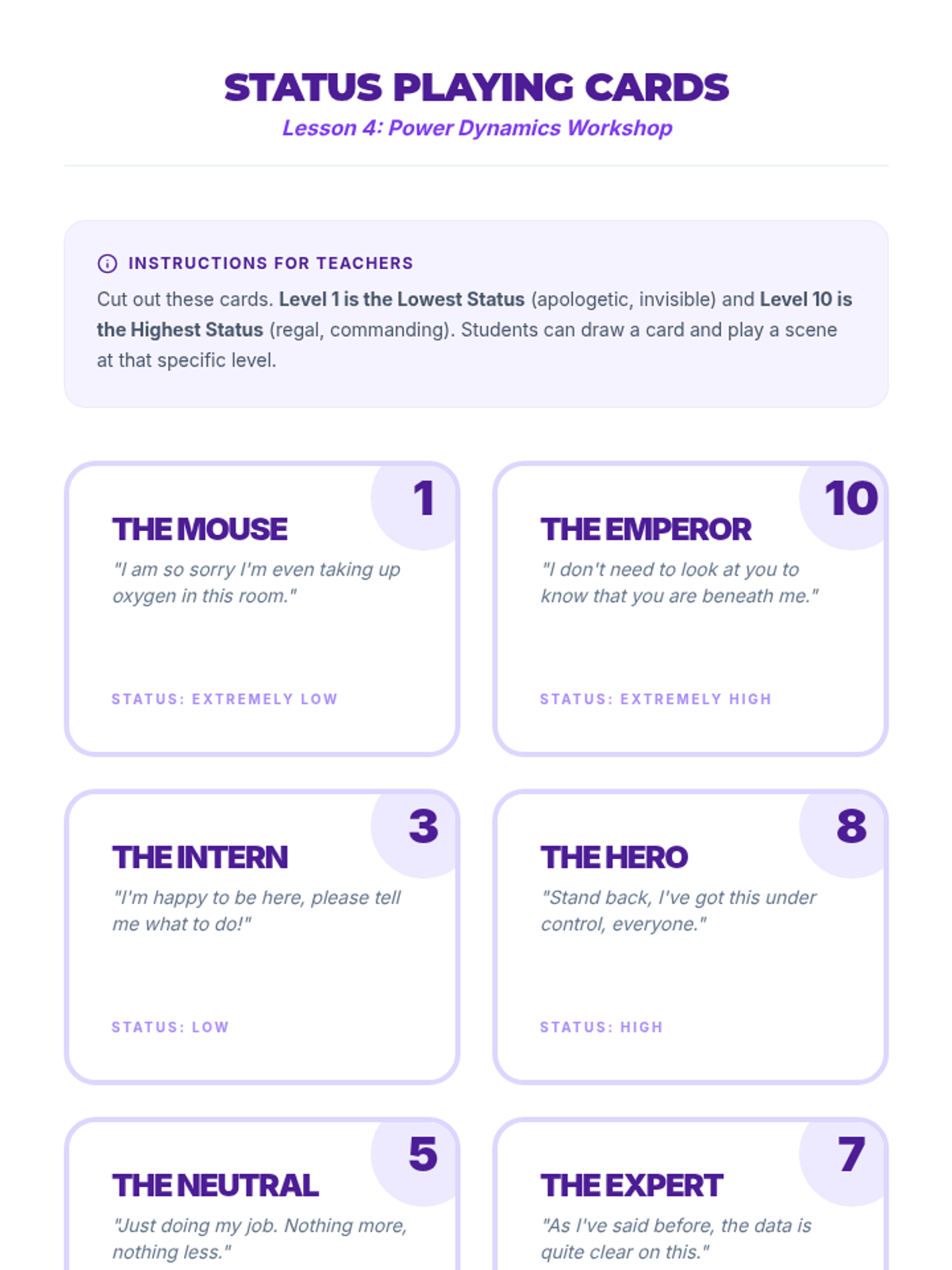 Explores Keith Johnstone’s status transaction theory to manipulate power dynamics through subtle vocal and physical cues in performance.