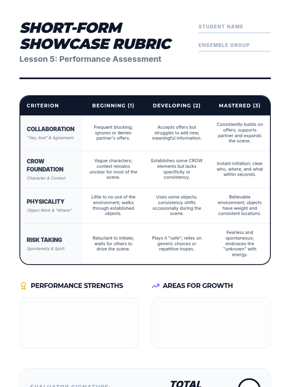 The final performance lesson where students apply all learned skills in a fast-paced short-form improv showcase.