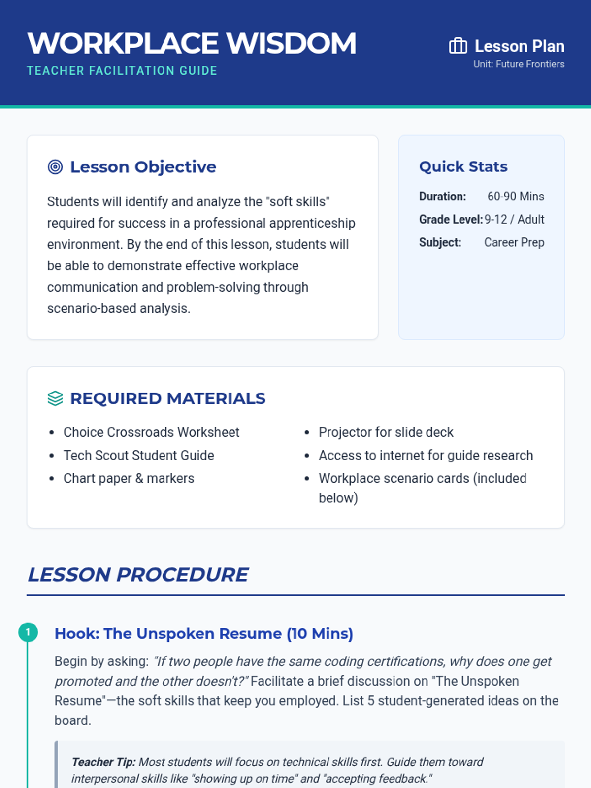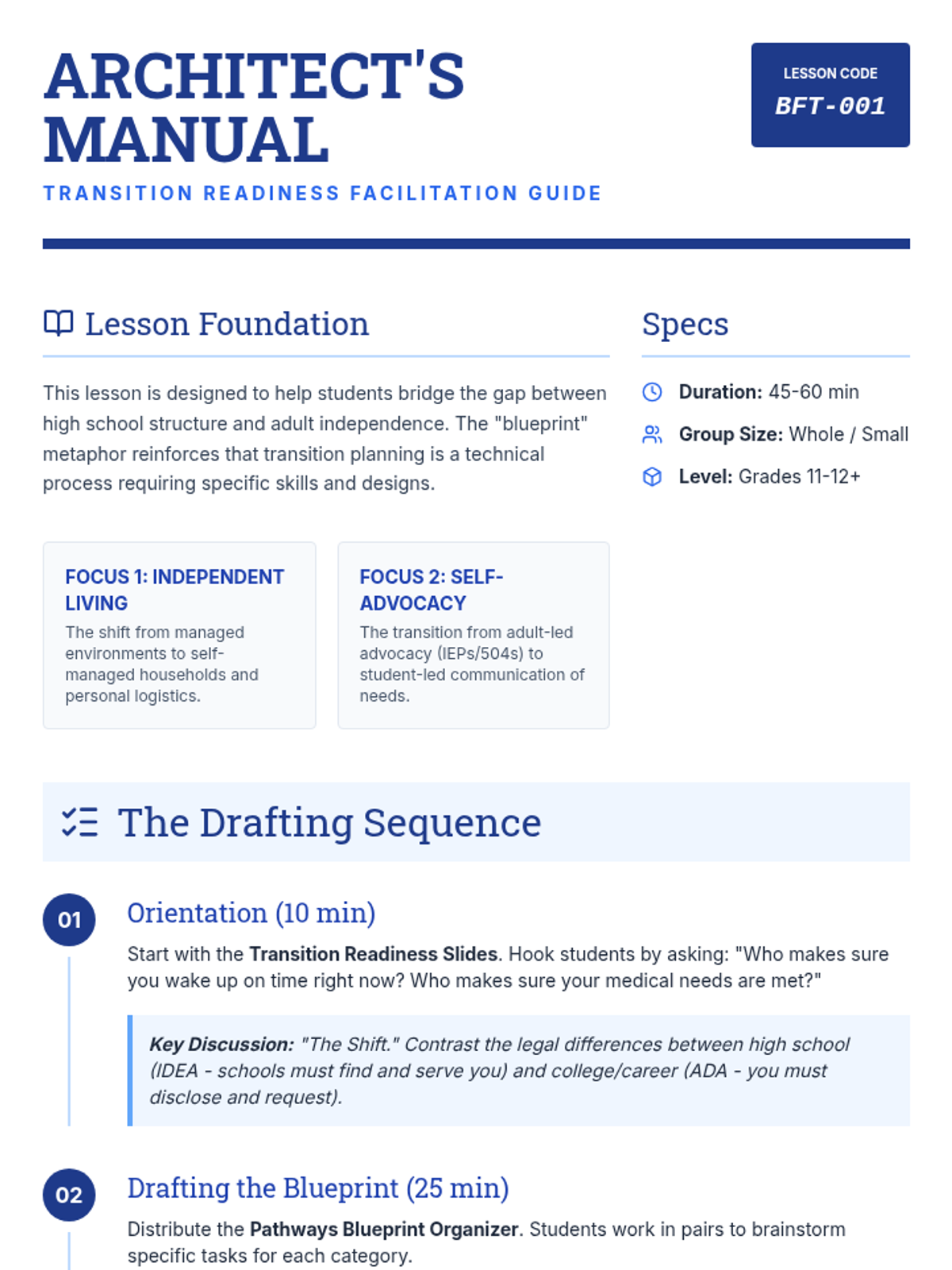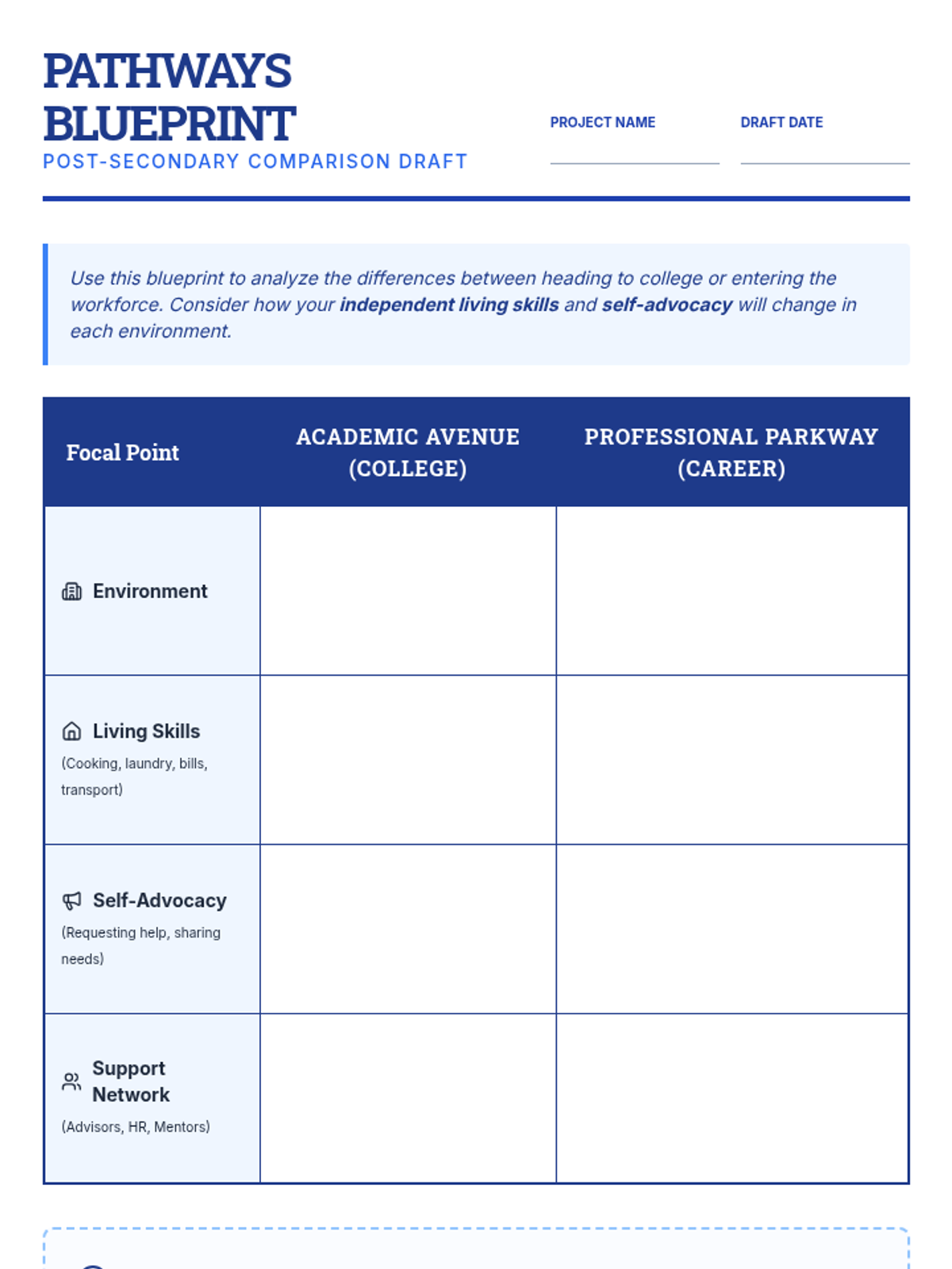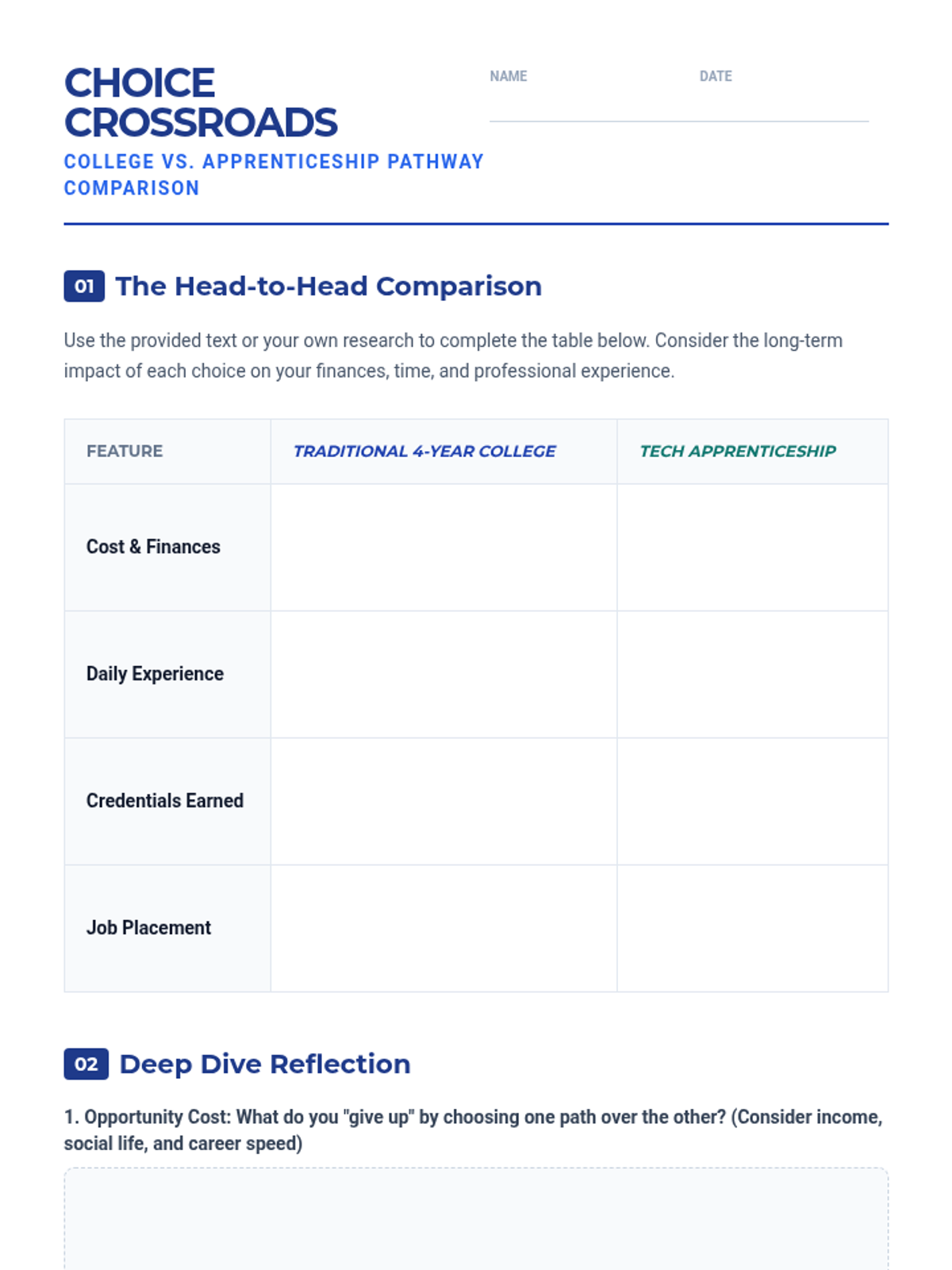 College selection, application workflows, and financial aid navigation including FAFSA and scholarship acquisition. Builds skills in personal statement writing and career exploration to align post-secondary choices with long-term professional goals.