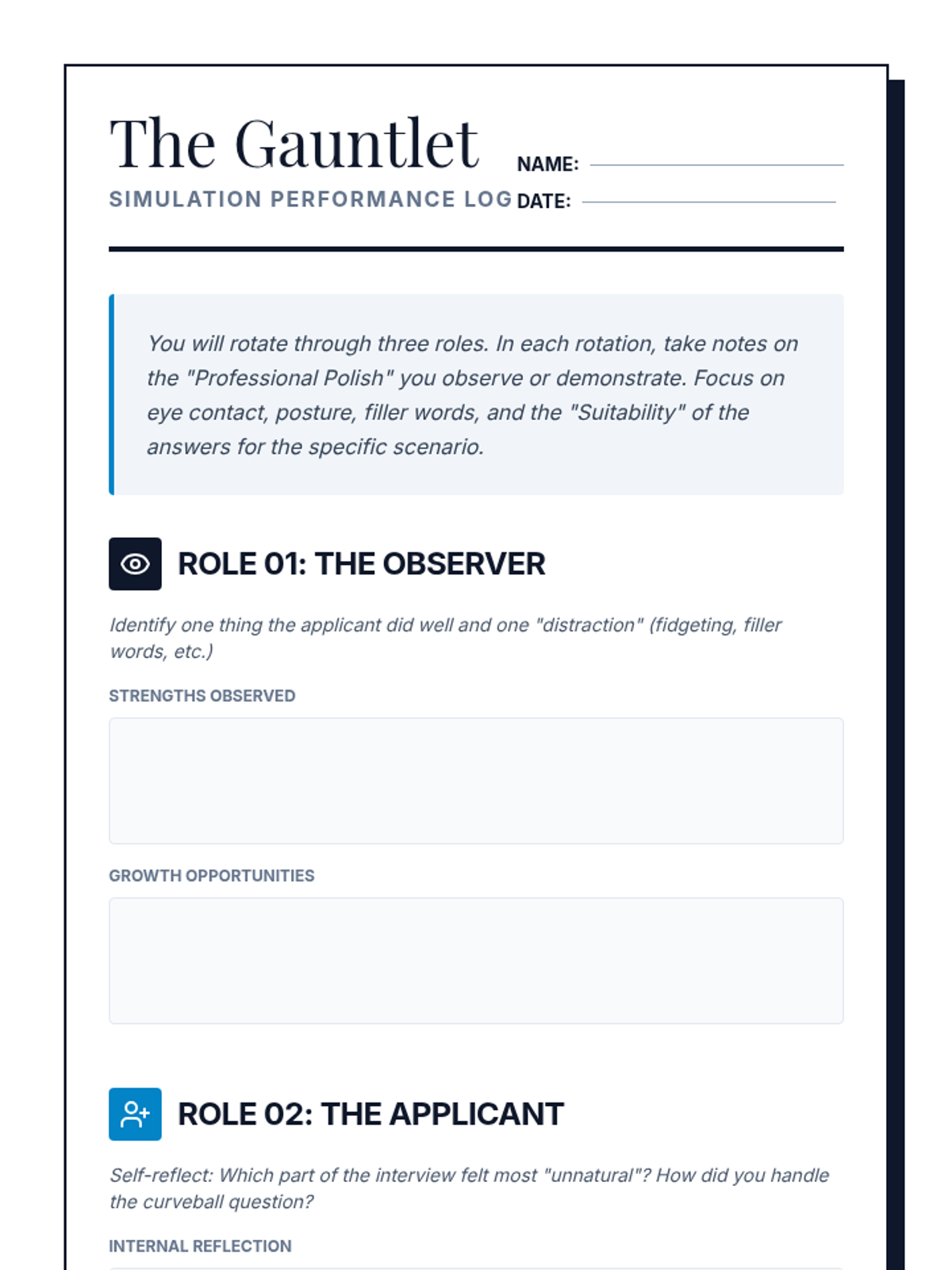 Prepares students for various interview formats and difficult scenarios. Focuses on the STAR method for behavioral questions, researching the interviewers themselves, and practicing high-pressure situational responses.