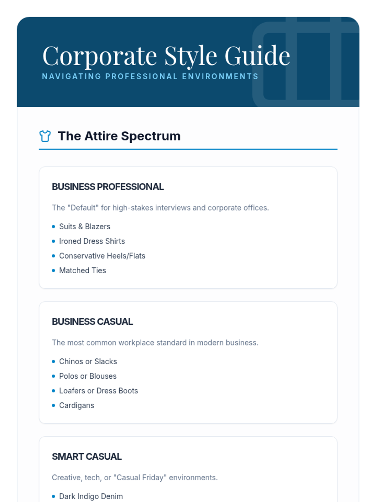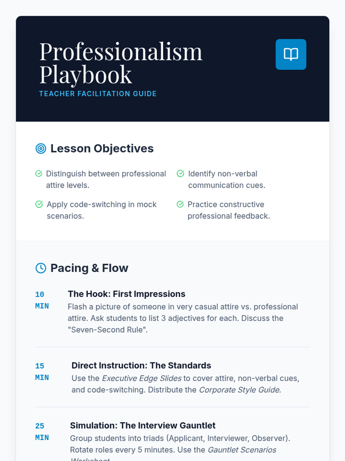 A comprehensive lesson for high school seniors on mastering professional etiquette, covering business attire, communication styles, and workplace conduct. Includes a high-stakes role-play simulation to practice real-world scenarios.