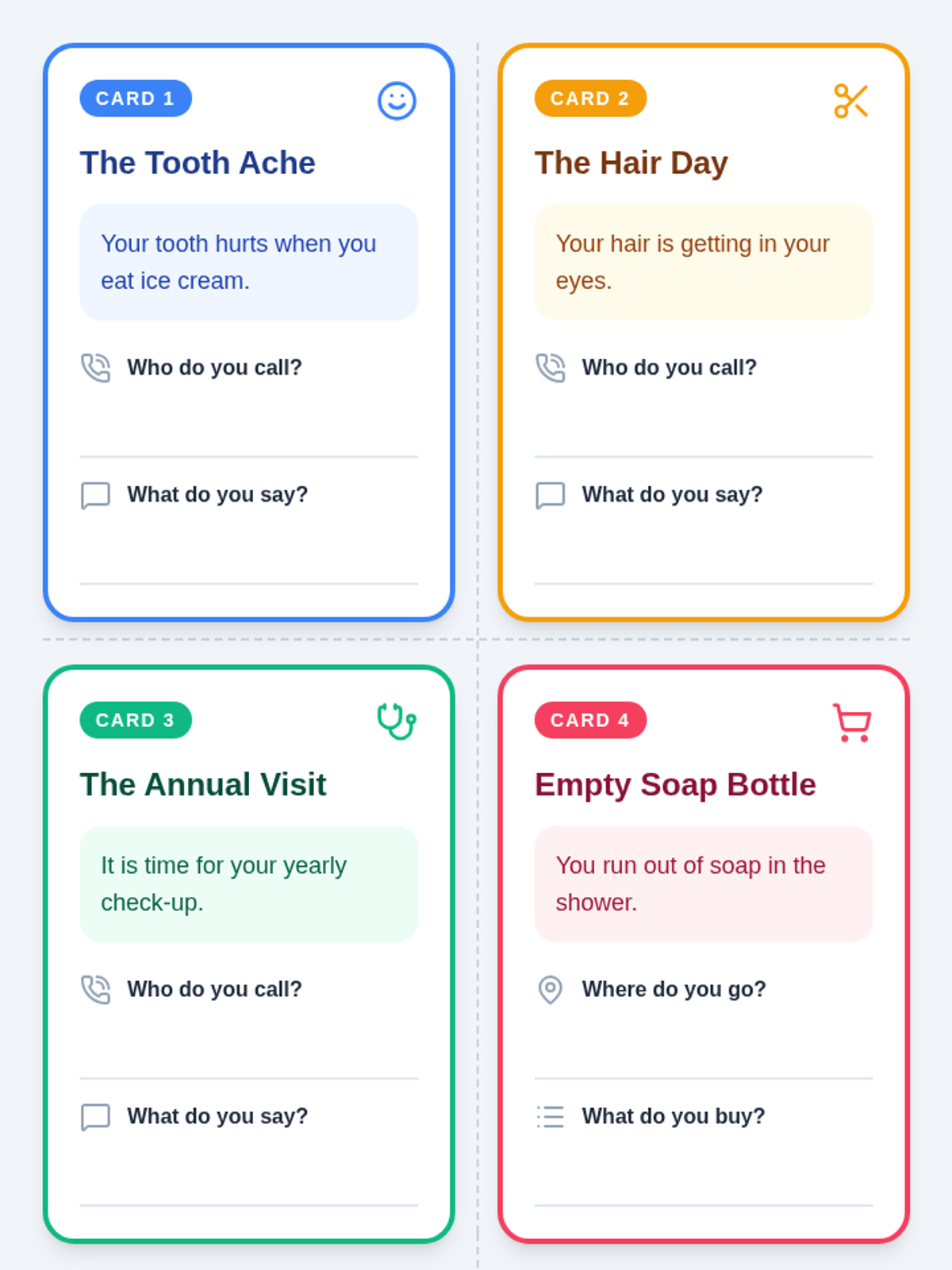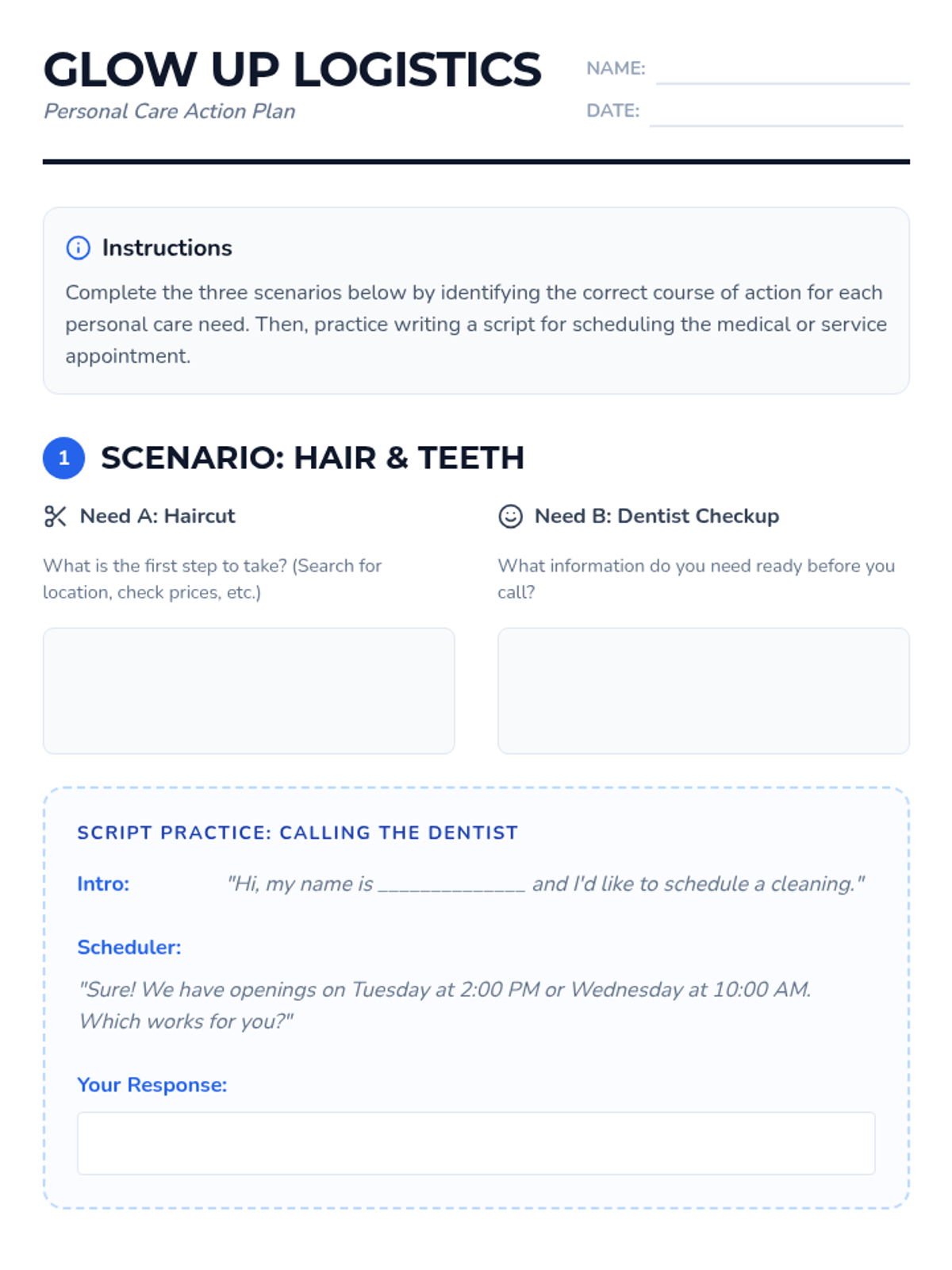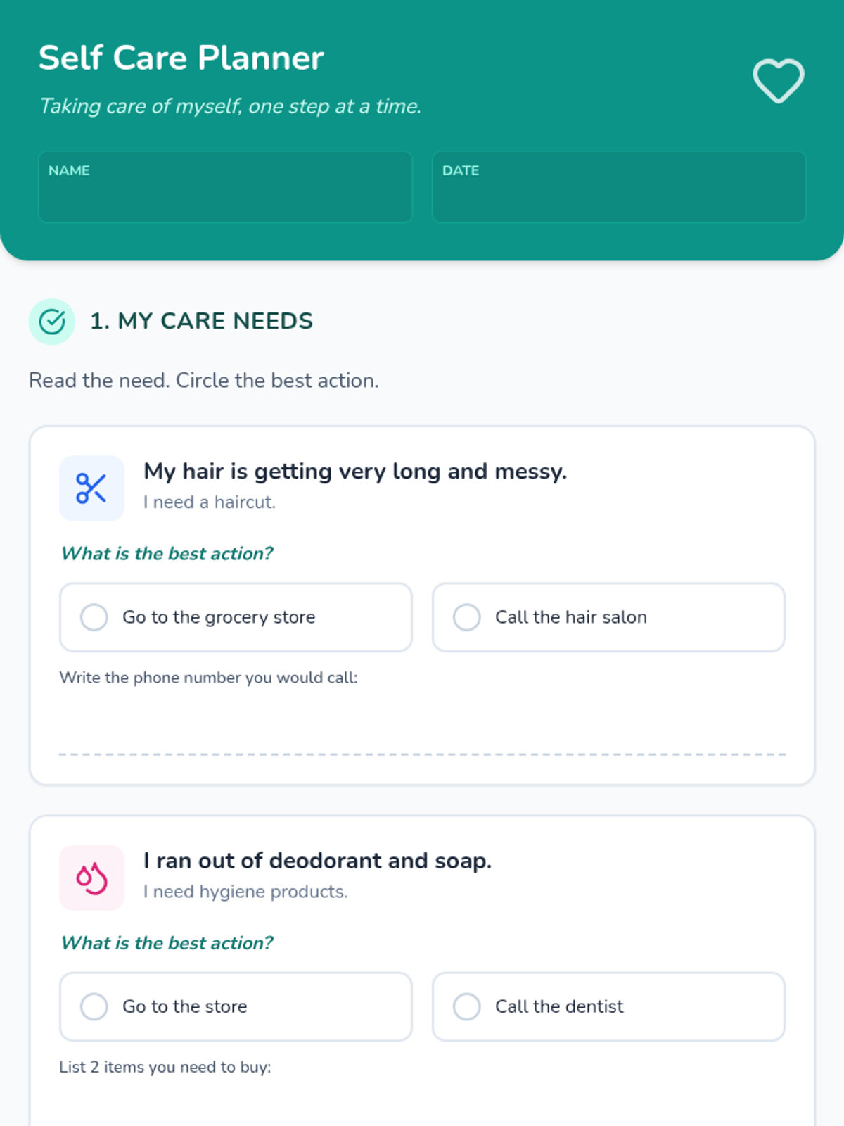 A practical lesson focused on the logistics of personal care, teaching students how to identify necessary actions for hygiene and grooming, and the specific steps to schedule medical appointments.