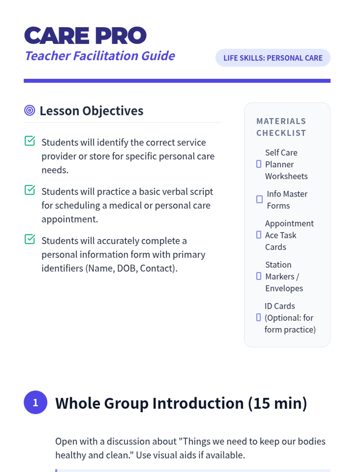 A practical life skills lesson focused on managing personal care needs, scheduling medical appointments, and completing essential personal information forms. Designed for Level 2 learners with simplified text and visual supports.